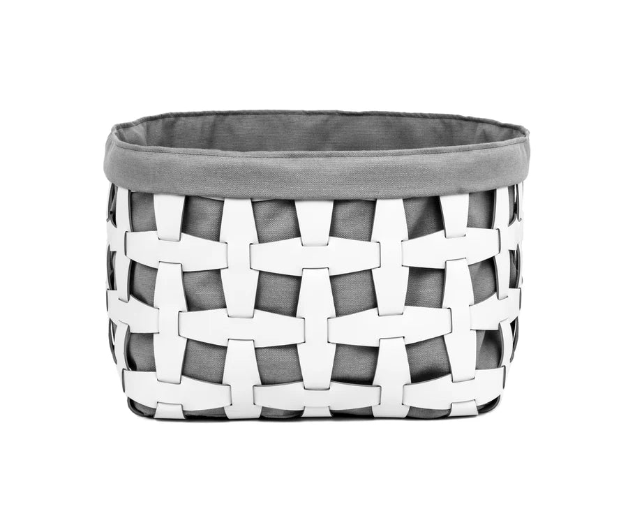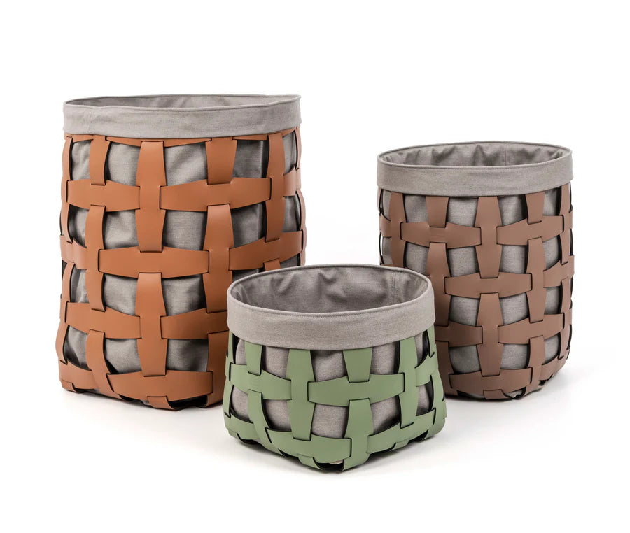 Der Pinetti Hook Korb in grosser Ausführung verbindet Leder und Baumwolle in einem ausgewogenen Materialkontrast. Er ist handgewebt aus umweltfreundlichen, waschbaren Materialien und eignet sich auch für den Einsatz im Außenbereich.