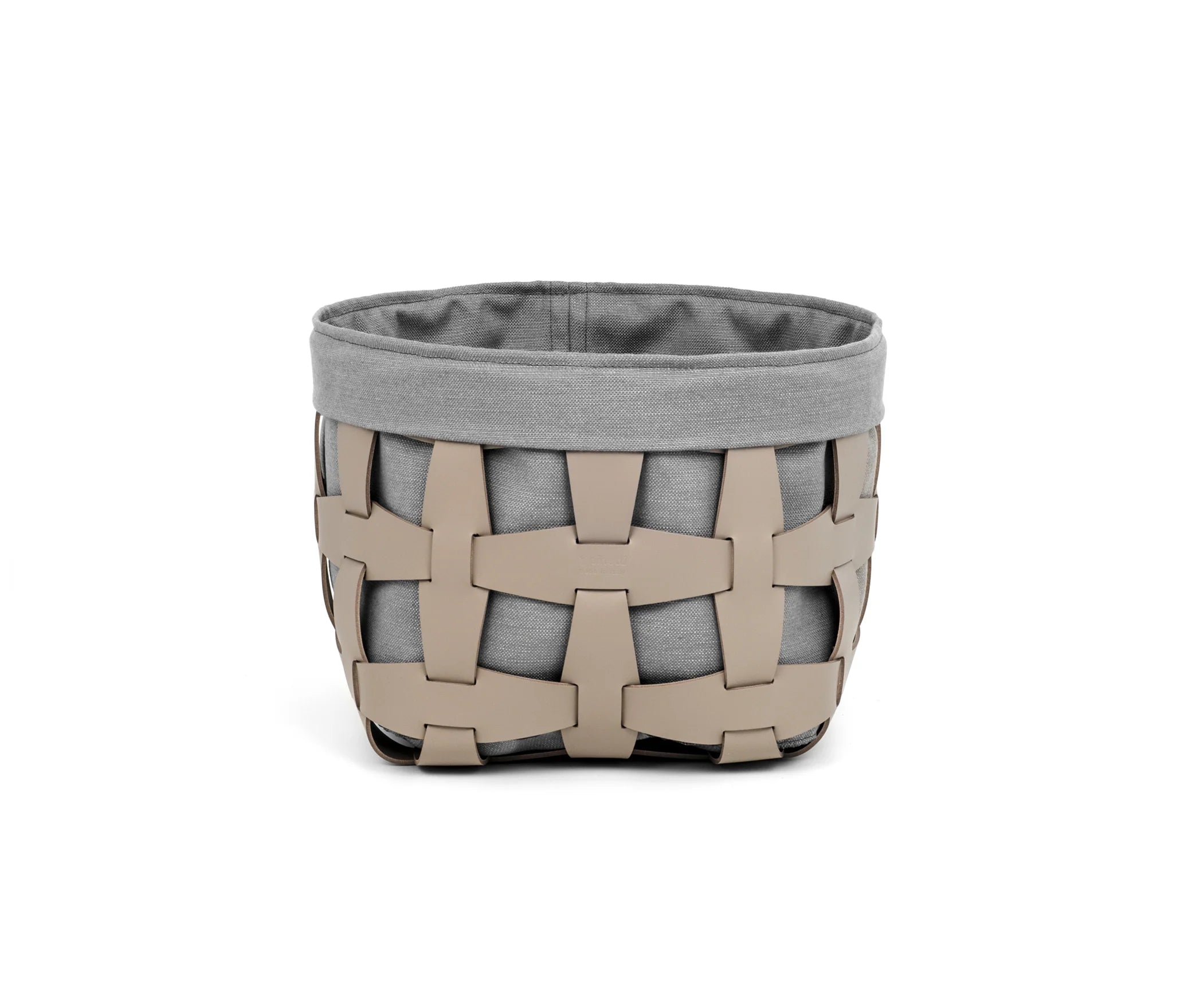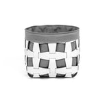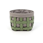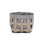 Der elegante Korb aus der Hook-Kollektion ist aus recyceltem Leder gefertigt und mit einem Innenfutter aus Leinen-Baumwolle ausgestattet. Die gitterartige Struktur aus Lederbändern prägt das charakteristische Design.