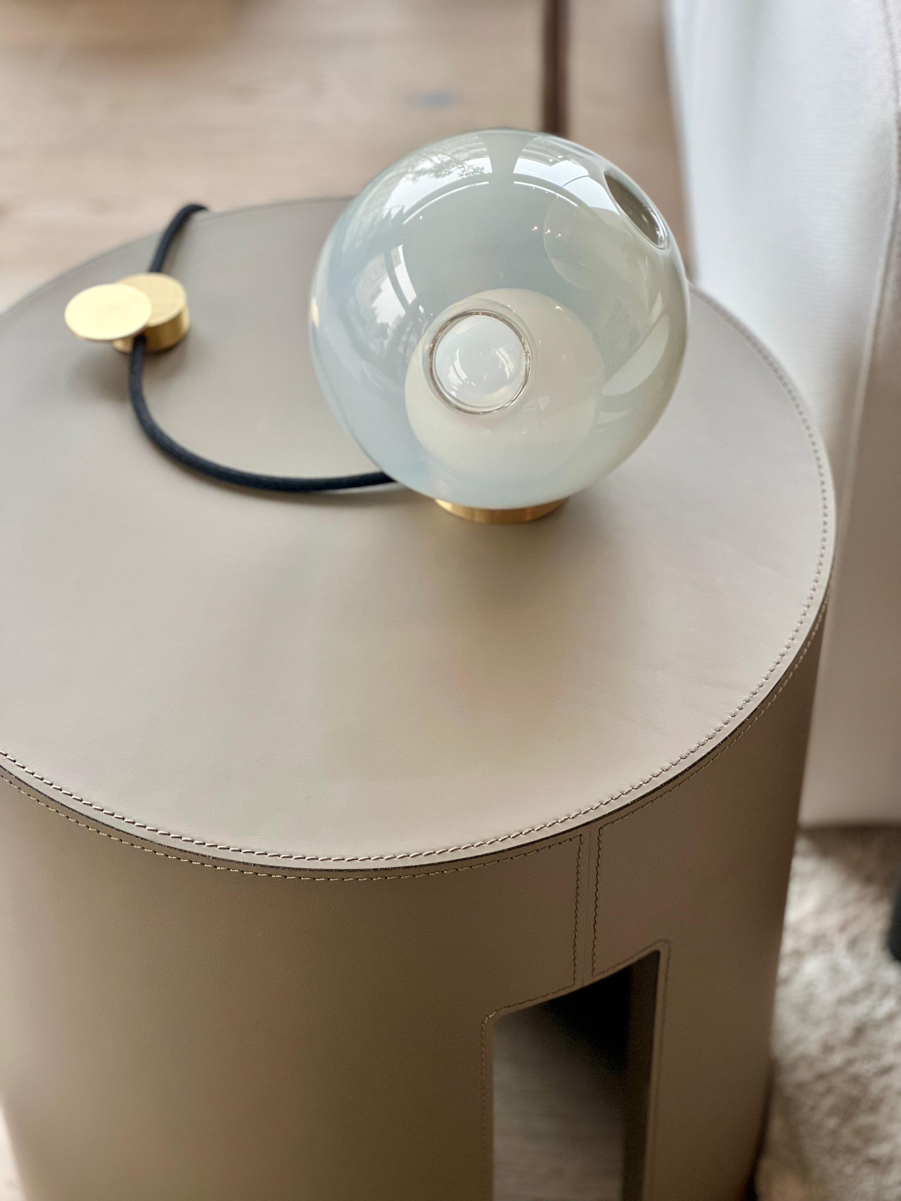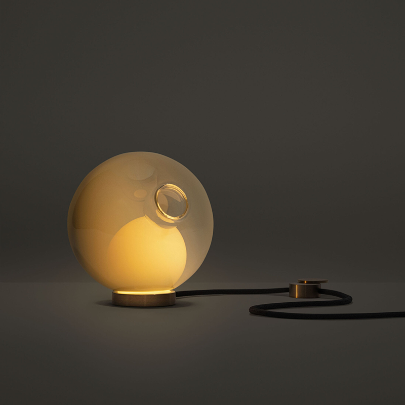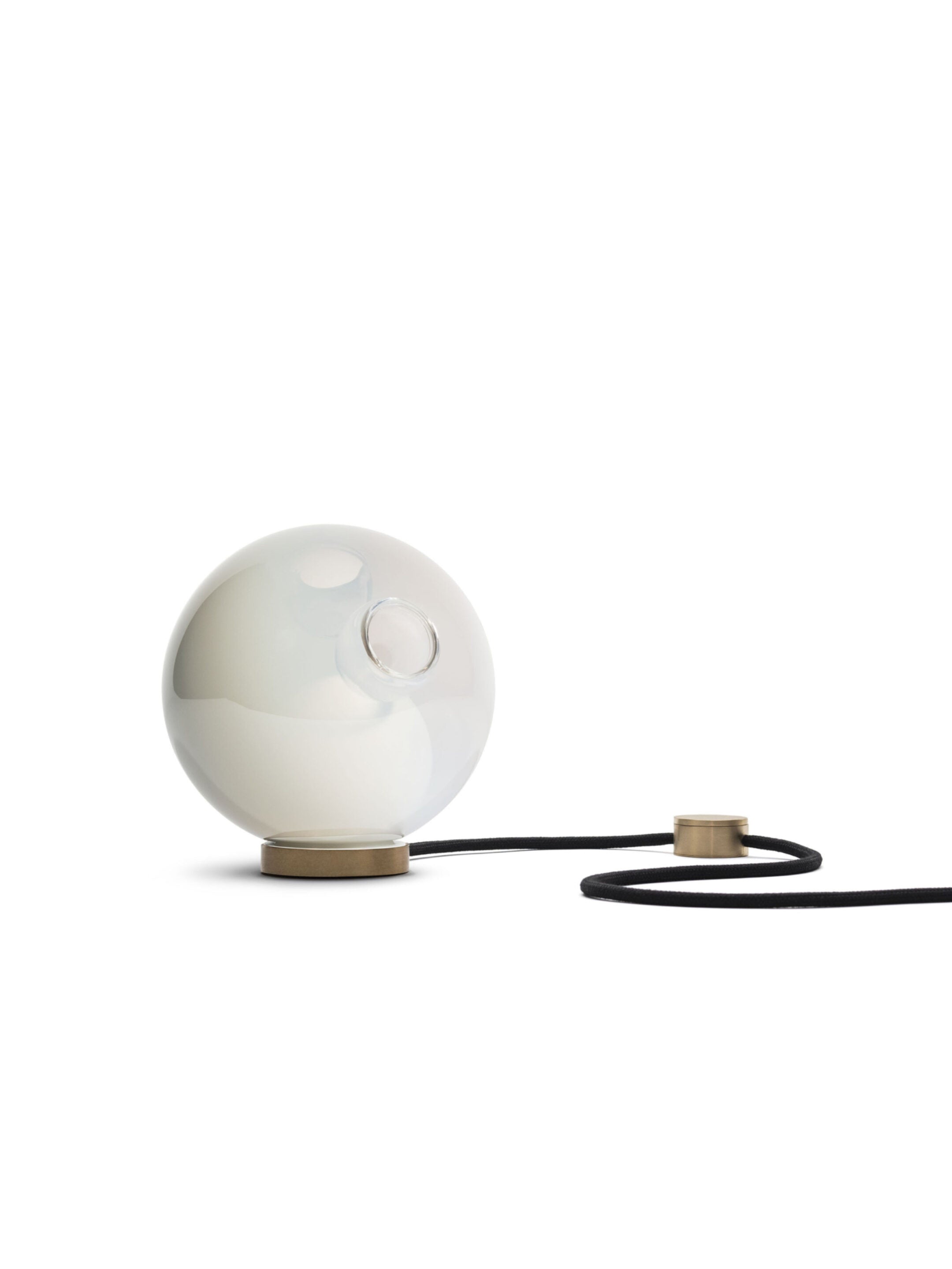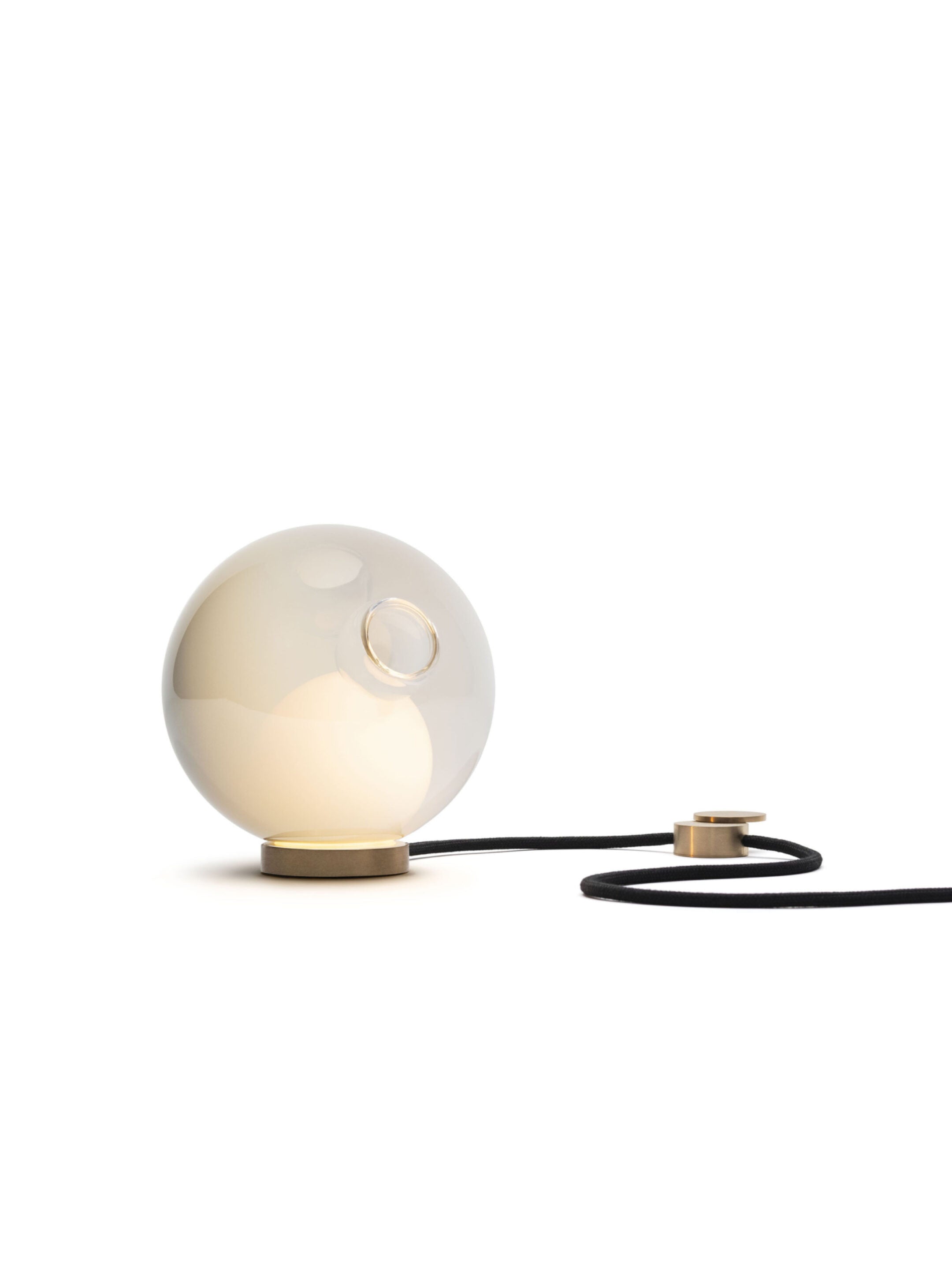 Die Tischleuchte 28t von Bocci ist eine einzelne Pendelleuchte aus mundgeblasenem Glas. Sie wird mit einem kleinen Regler aus Messing gedimmt. Ein wahrer Eyecatcher!