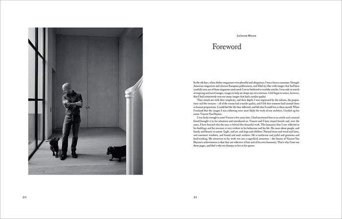 Ein Vorwort der engen Freundin und Oscar-prämierten Schauspielerin Julianne Moore bietet den Einstieg, während Architekt Nicola di Battista und Architekturkritiker Marc Dubois den breiteren Kontext von Van Duysens Beitrag zur zeitgenössischen Architektur erläutern. Eine illustrierte Chronologie liefert einen vollständigen Überblick über die jüngsten Projekte des Architekten.