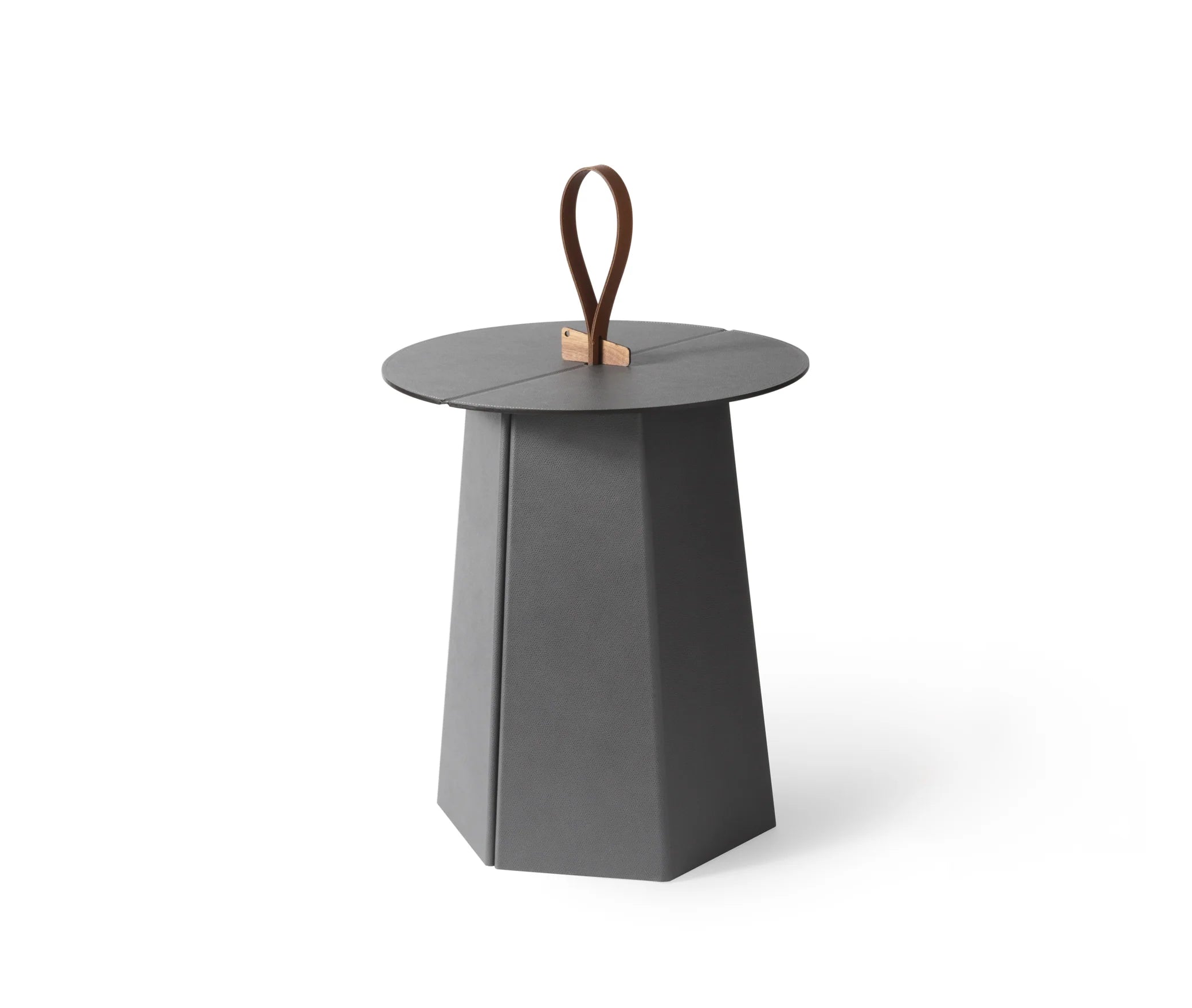 Der PINETTI Aile Beistelltisch kombiniert praktische Faltfunktion mit elegantem Design. Ein hexagonaler Sockel trägt die runde Tischplatte, die sich dank eines Lederbands in der Mitte mit nur einem Zug schnell und einfach zusammenklappen lässt. Ideal für flexible Wohnräume.