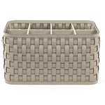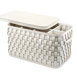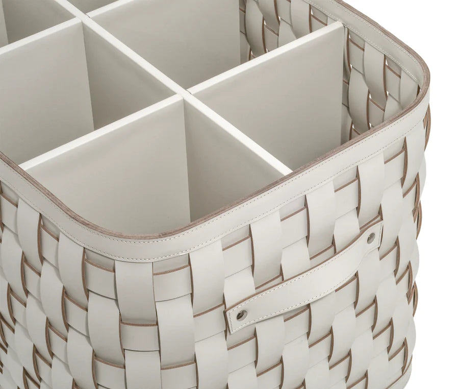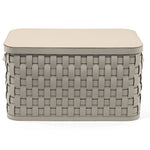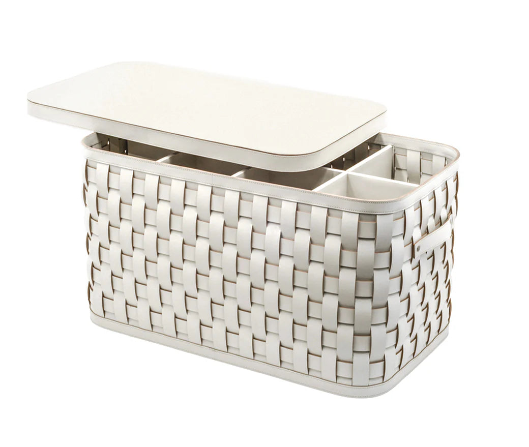Handgewebt aus speziellem, wasser- und lichtbeständigem Kunstleder. Integrierte Holzfächer für strukturierte Aufbewahrung. Geeignet für den Innen- und Aussenbereich.