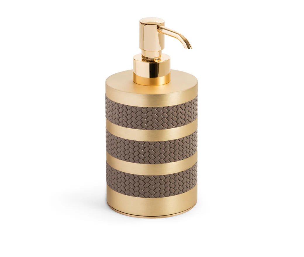 Der PINETTI Olimpia Seifenspender aus der Saturno-Kollektion verbindet satinierte Messingoberflächen mit echten italienischen Lederstreifen. Handgefertigt und elegant, verleiht er Ihrem Badezimmer eine edle Note. Erhältlich auch in Chrom oder gebürstetem Messing.