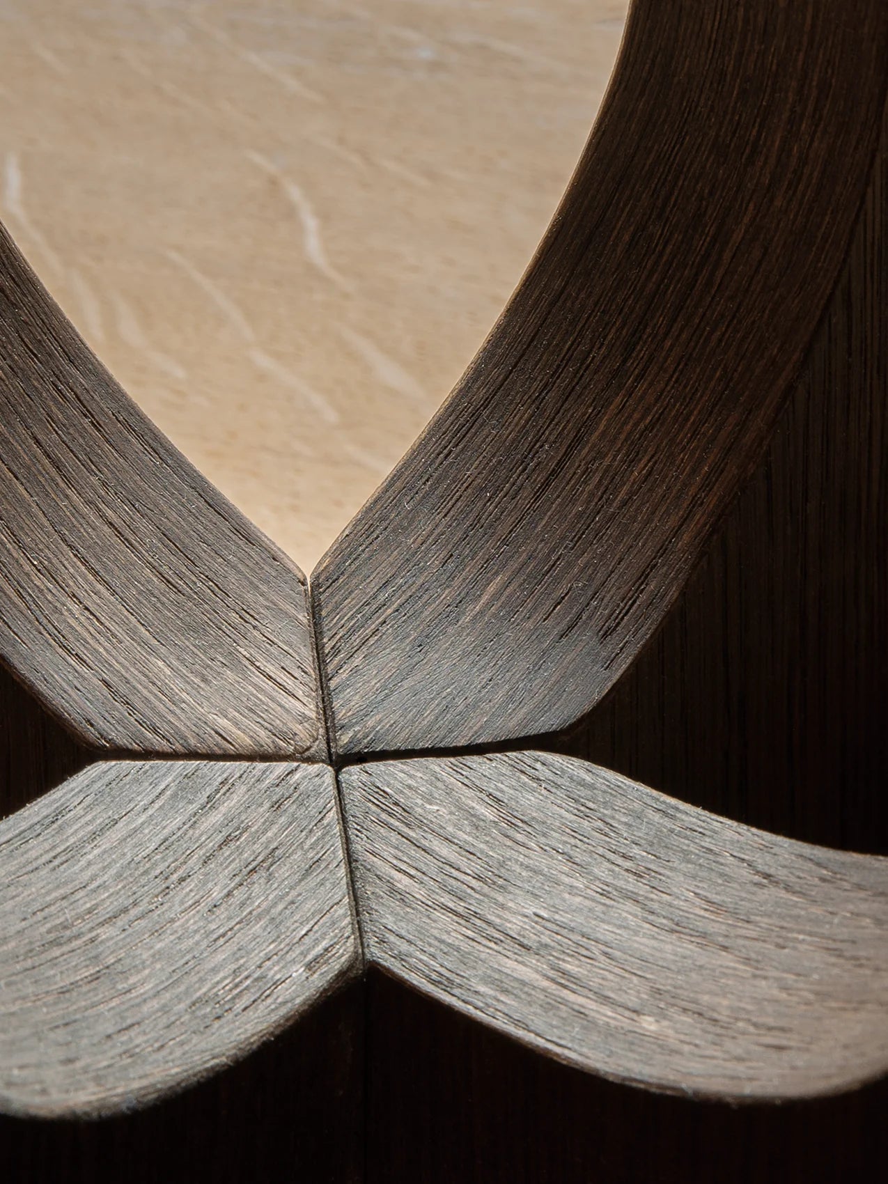 Eiche (geölt oder dunkel gebeizt) oder Naturstein-/Marmorplatte, kombiniert mit MDF, gebürstetem Messing und pulverbeschichtetem Stahl – hochwertig, stabil und langlebig.