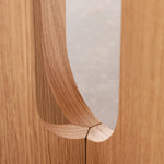 Eichenfurnier (natur oder dunkel gebeizt) auf MDF, ergänzt durch pulverbeschichteten Stahl und PA-Gleiter – robust, langlebig und pflegeleicht.