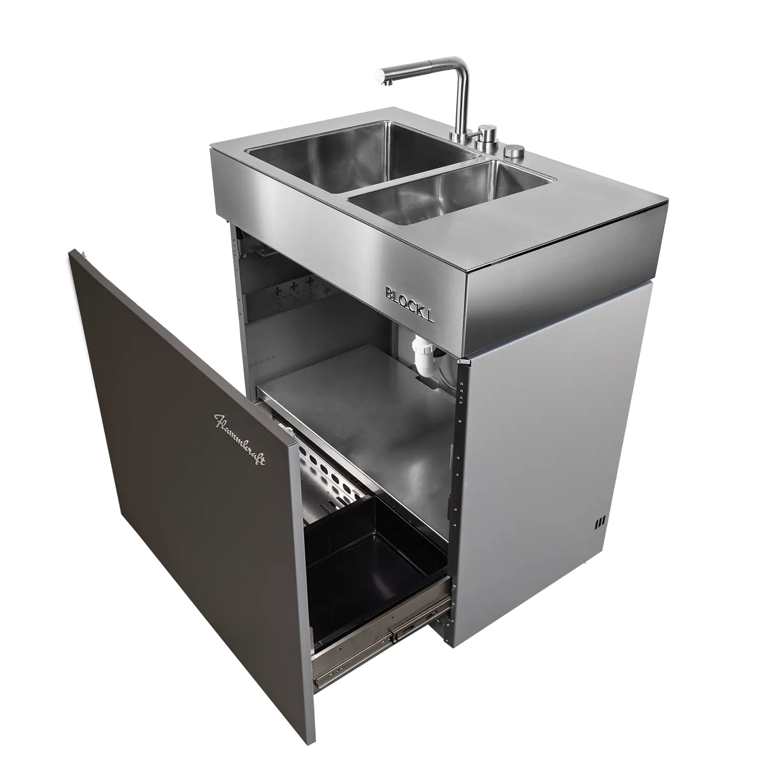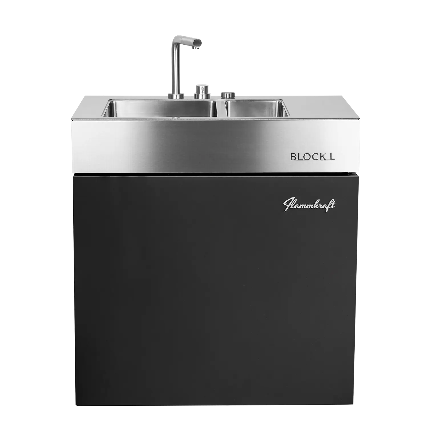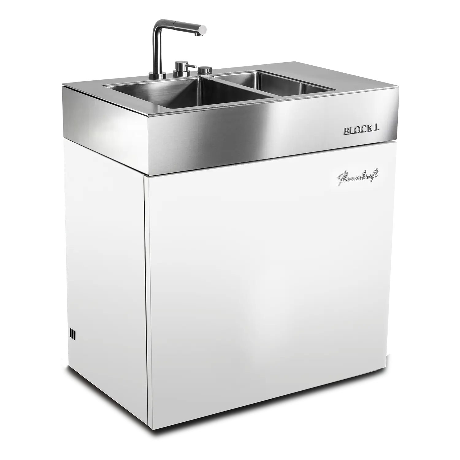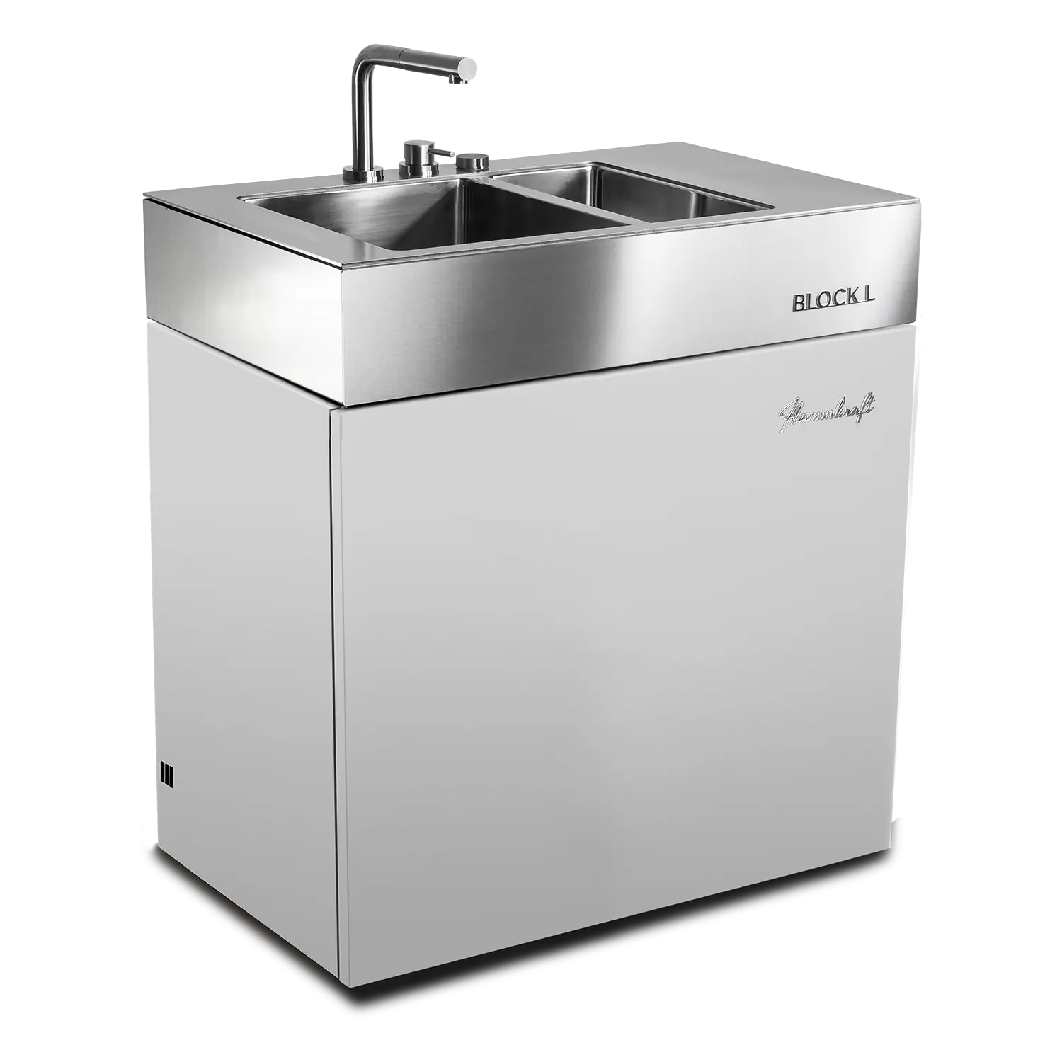 Der Block L ist das Spül- und Wasser-Modul der Flammkraft Block-Serie. Mit isoliertem Doppelbecken, versenkbarem Edelstahl-Wasserhahn und flexiblen Anschlussmöglichkeiten bietet er maximalen Komfort für die Outdoor-Küche – robust, funktional und vollständig aus Edelstahl gefertigt.