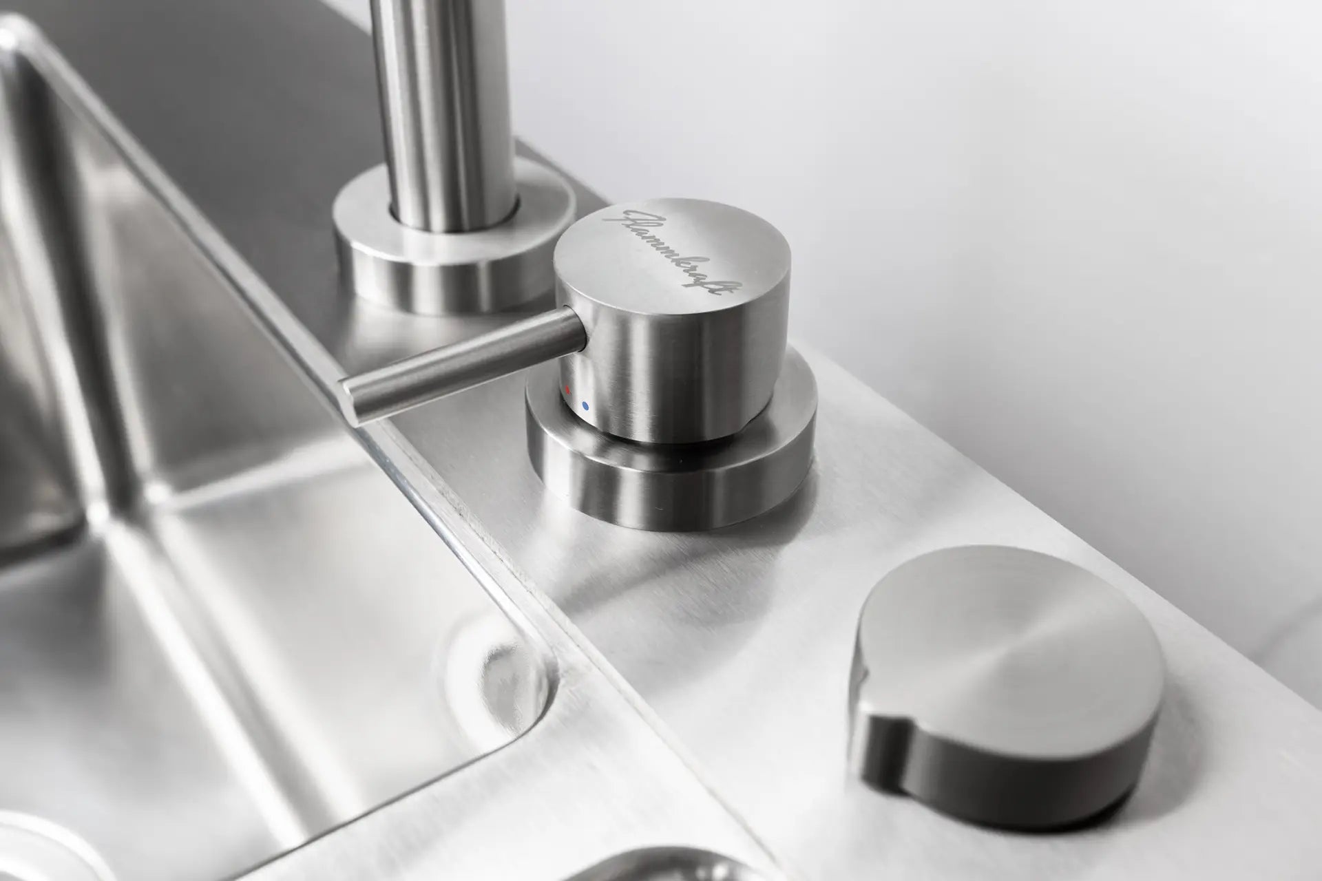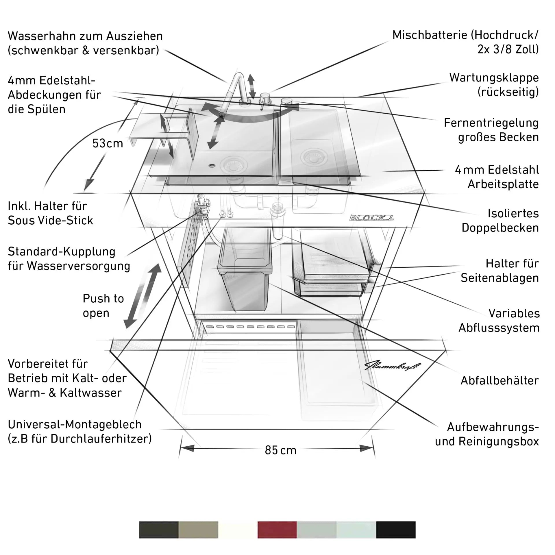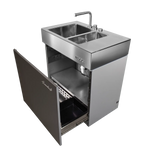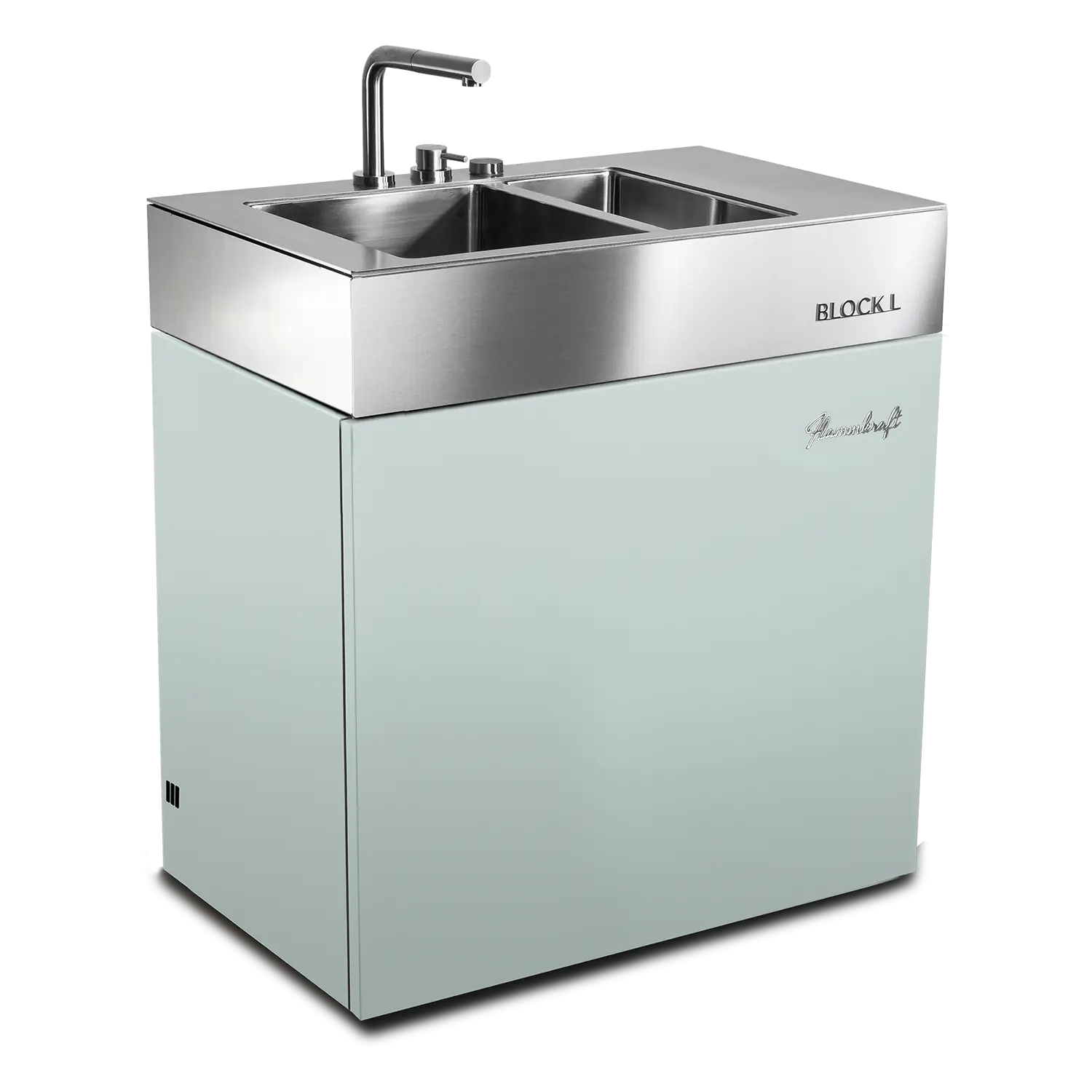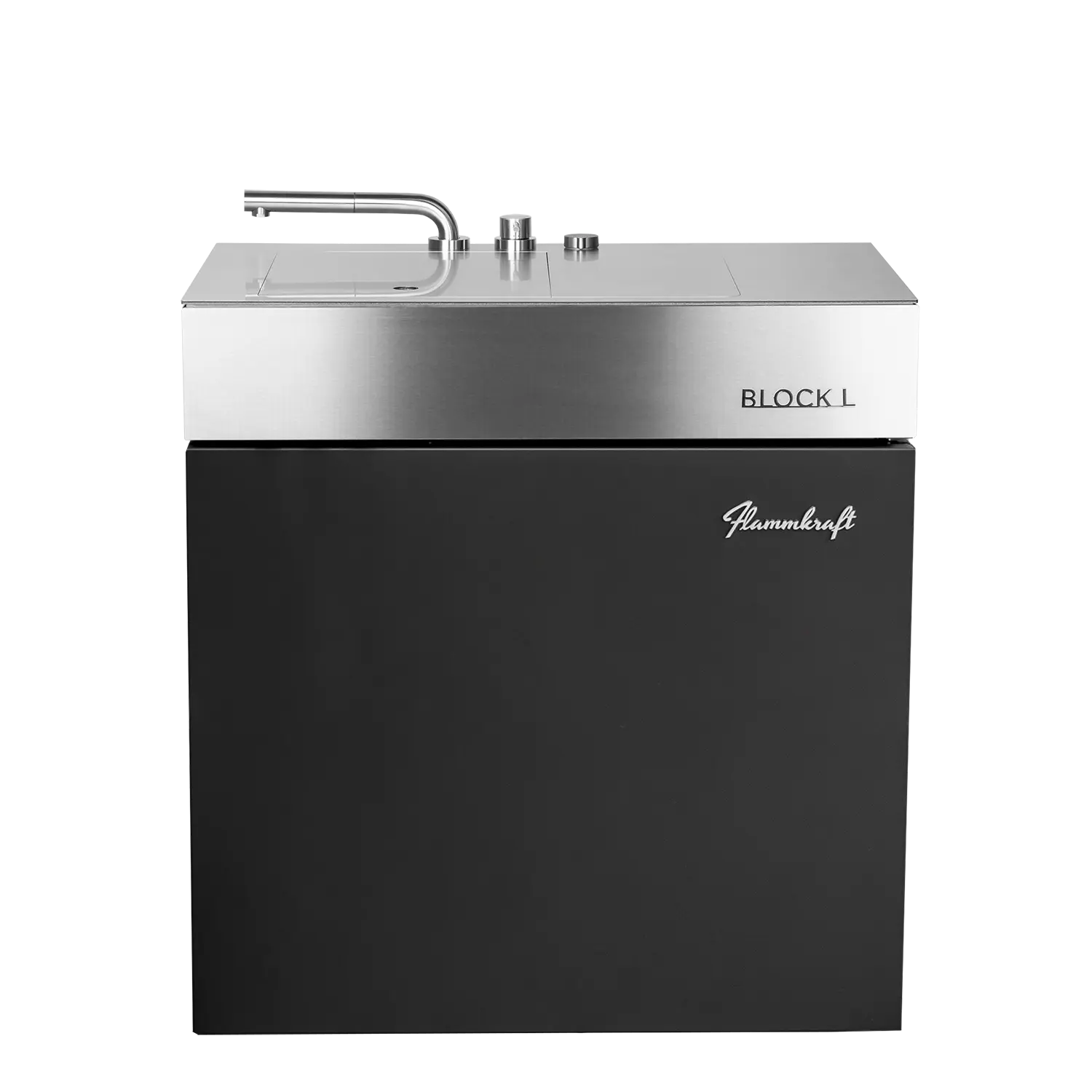 Der Block L ist das Spül- und Wasser-Modul der Flammkraft Block-Serie. Mit isoliertem Doppelbecken, versenkbarem Edelstahl-Wasserhahn und flexiblen Anschlussmöglichkeiten bietet er maximalen Komfort für die Outdoor-Küche – robust, funktional und vollständig aus Edelstahl gefertigt.
