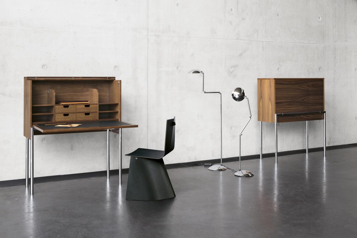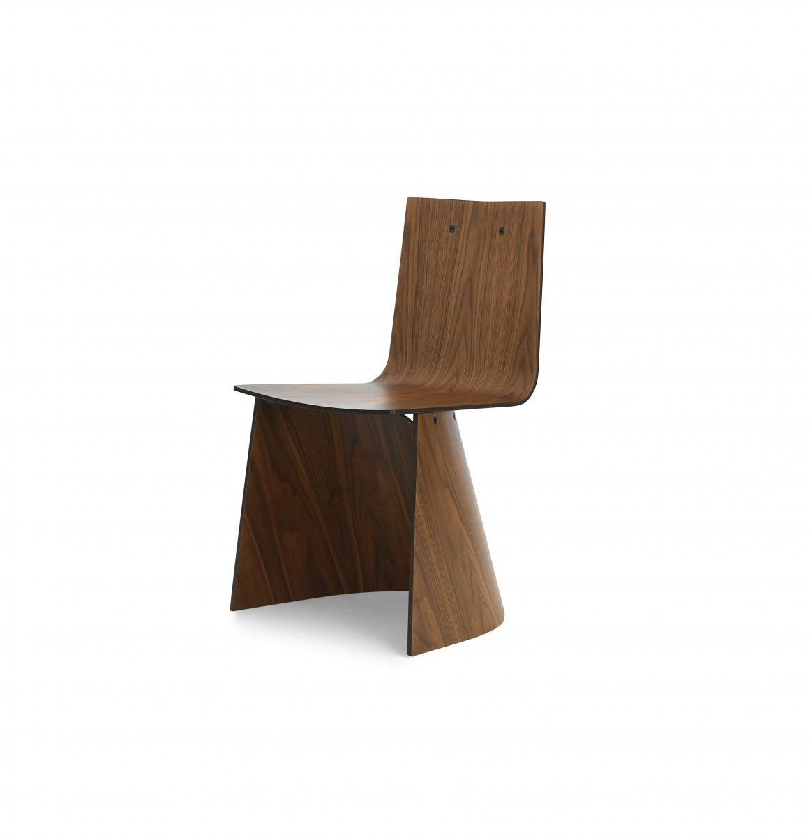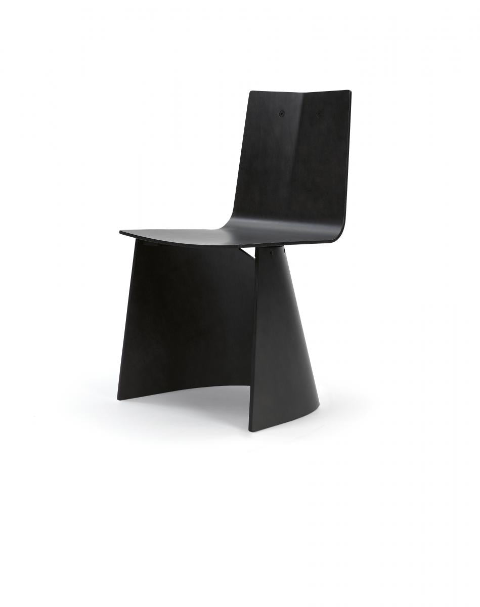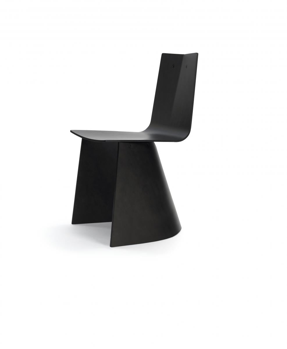 Formholz, echtholzfurniert in Eiche, klar lackiert oder schwarz lackiert, oder in Nussbaum, klar lackiert. Griff an Rückenlehne aus Kernleder in Mokkabraun.