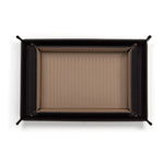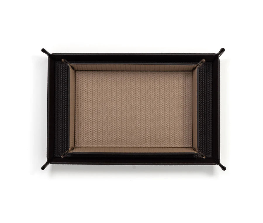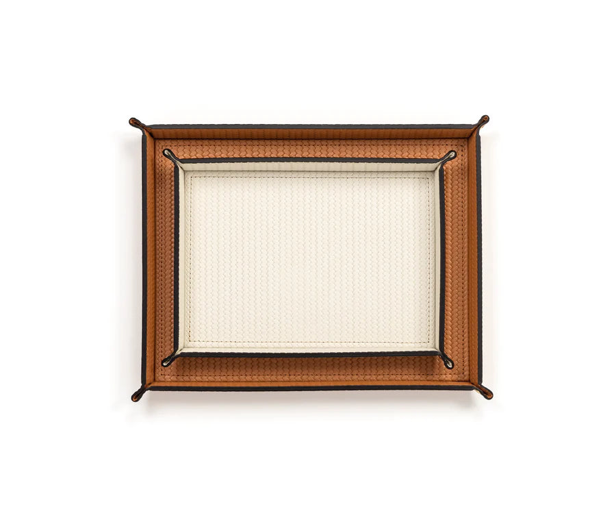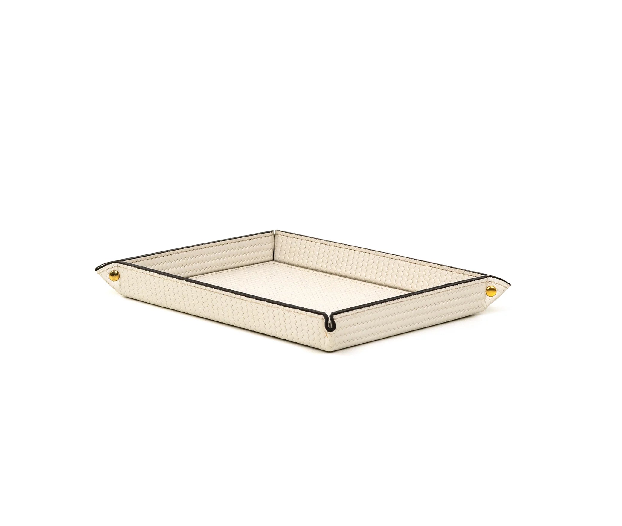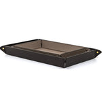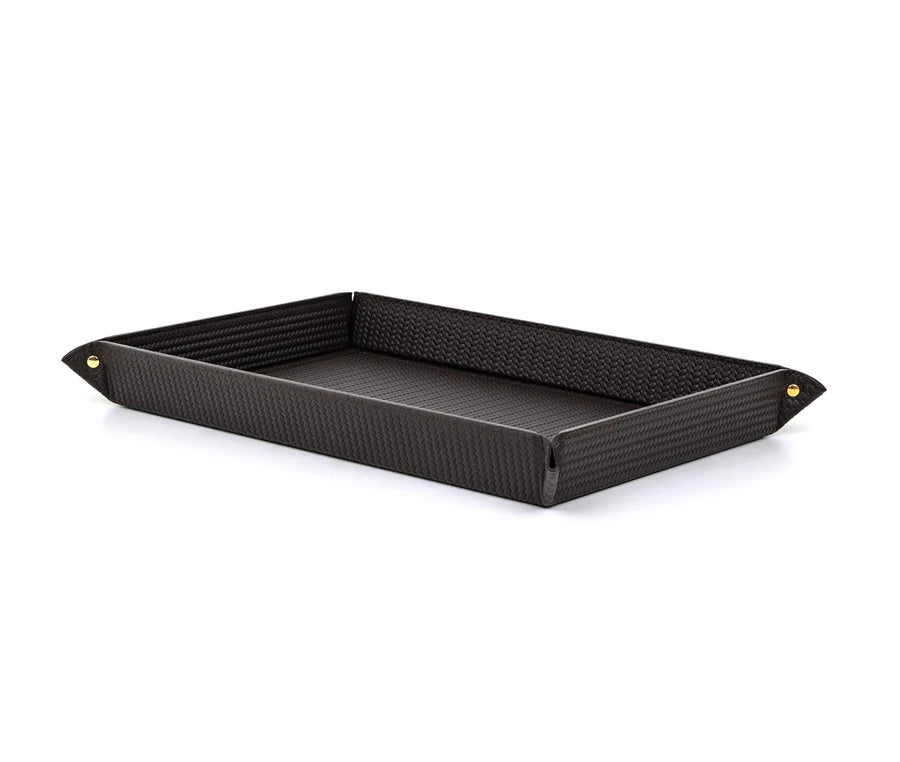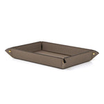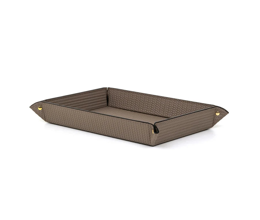 Das Tablett ist vollständig aus echtem Leder gefertigt und überzeugt durch seine makellose Verarbeitung sowie eine angenehme Haptik. Die Ecken sind mit goldenen Ziernieten akzentuiert, die dem Design eine edle, feine Note verleihen. Dank seiner vielseitigen Einsatzmöglichkeiten eignet sich das Ledertablett für den Eingangsbereich, das Schlafzimmer oder den Wohnraum. Es ist in vier Grössen sowie mit zwei unterschiedlichen Randhöhen erhältlich und lässt sich flexibel an individuelle Bedürfnisse anpassen.