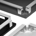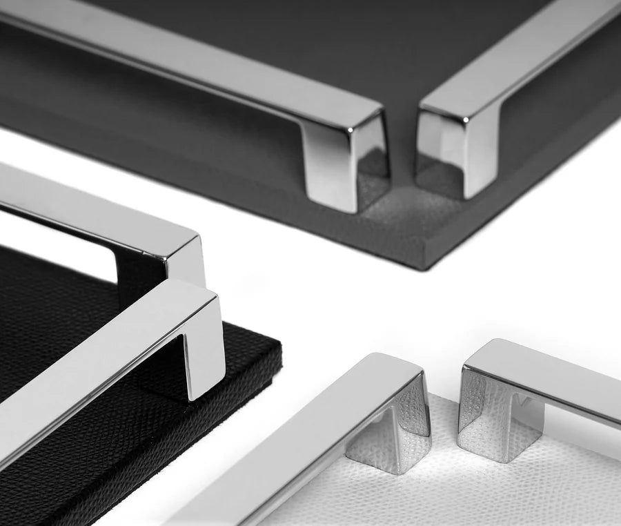 Kalbsleder mit rutschfester Unterseite, Metallgriffe in Chrom, Gold oder brüniertem Messing