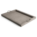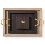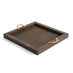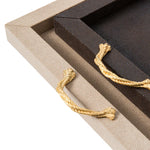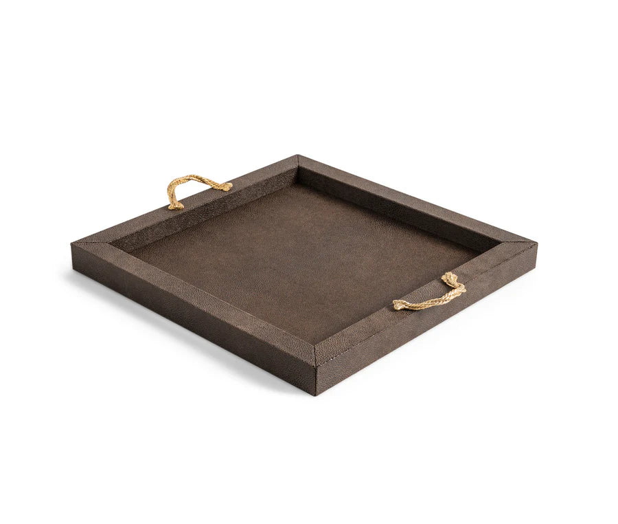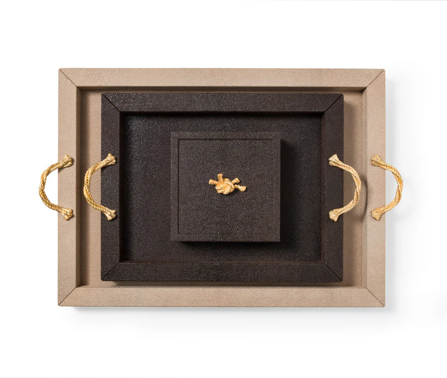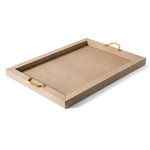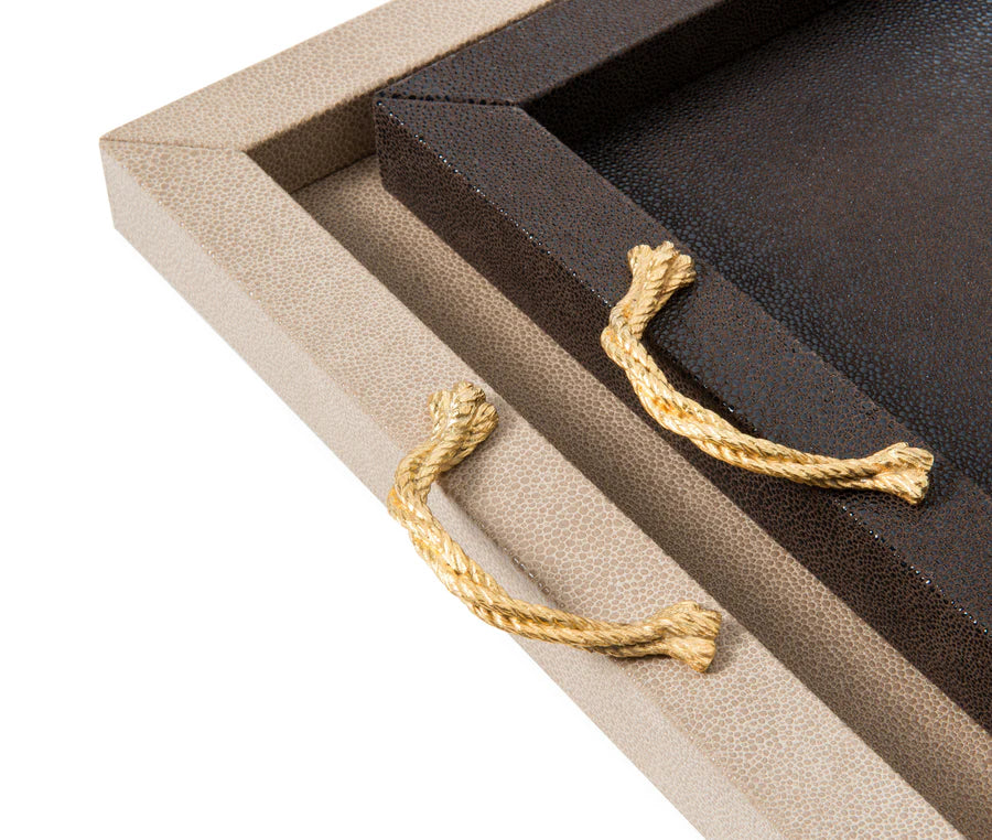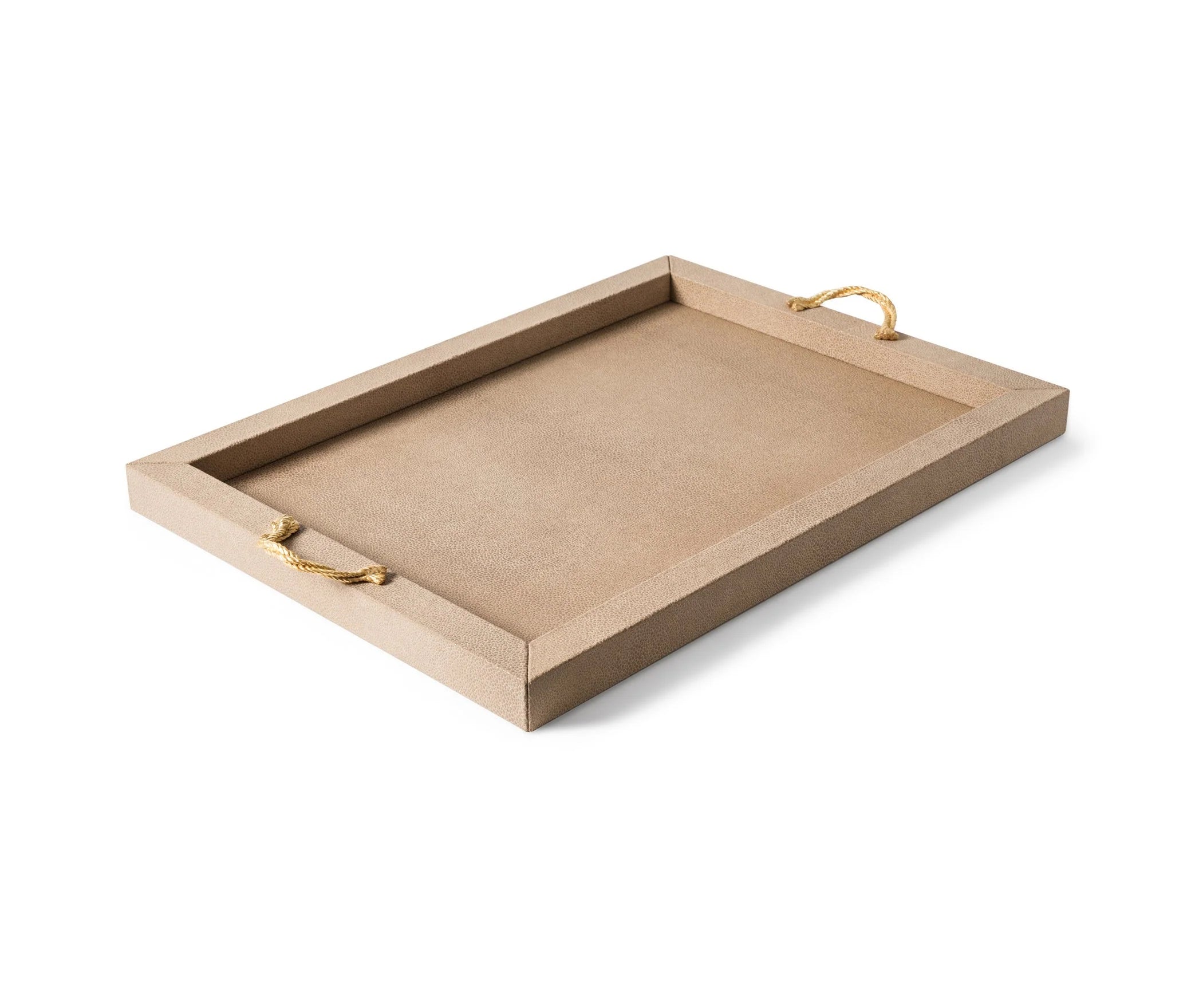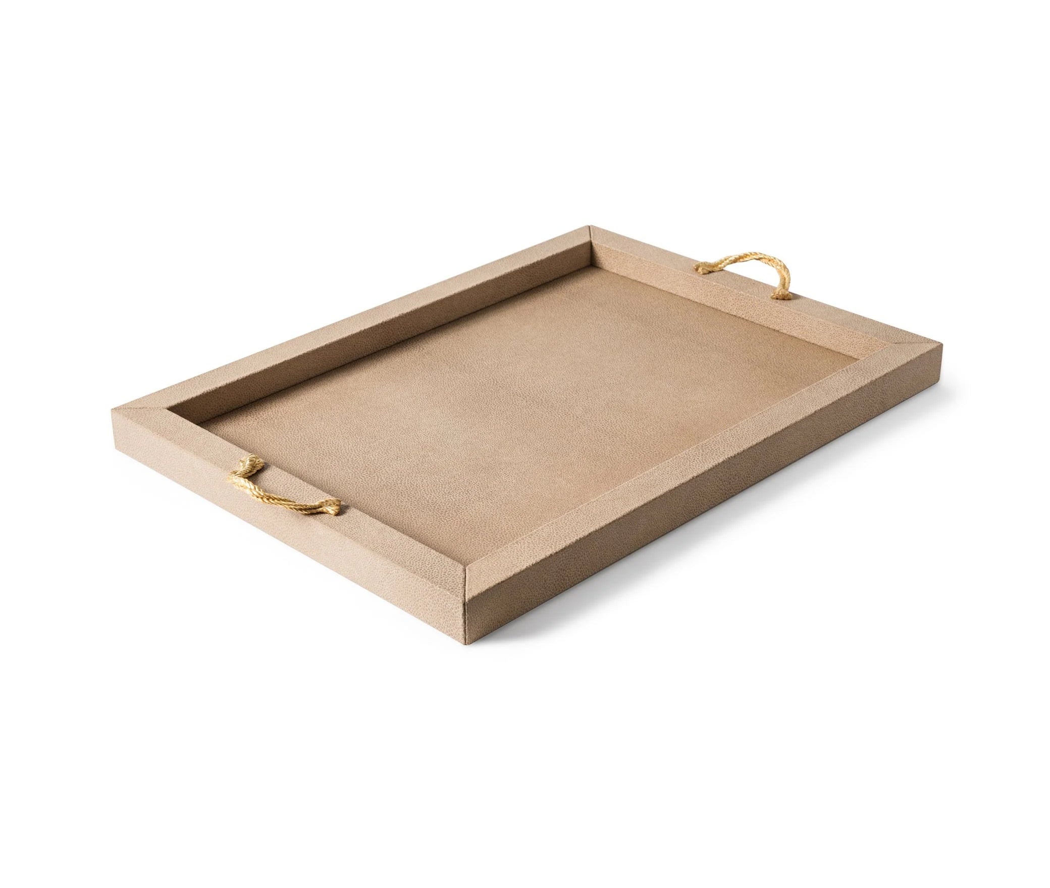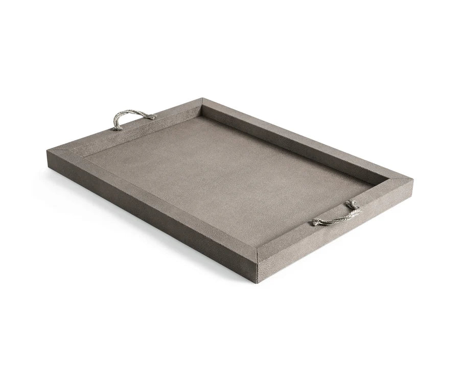 Das Thalia Tablett überzeugt durch seine schlichte, rechteckige Silhouette und eine elegante Materialkombination. Die Holzstruktur ist vollständig mit weichem, echtem Leder bezogen und wird durch zwei Metallgriffe akzentuiert, die wahlweise in Chrom oder in einer edlen 24k-Gold-Ausführung erhältlich sind.