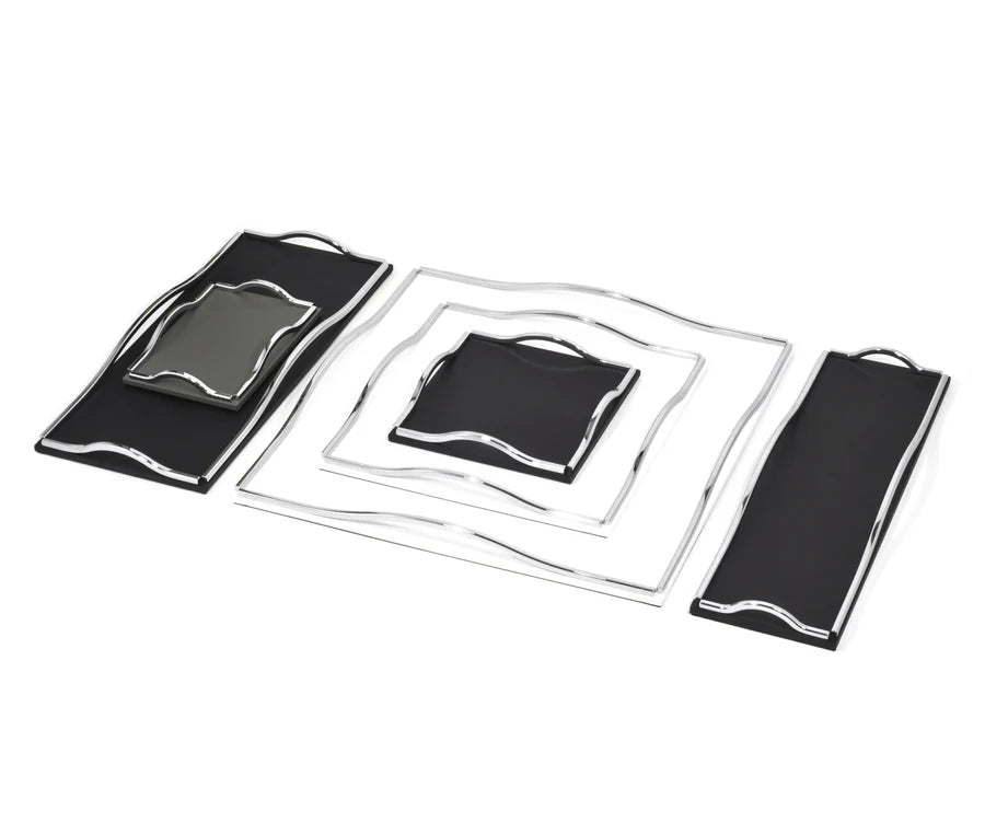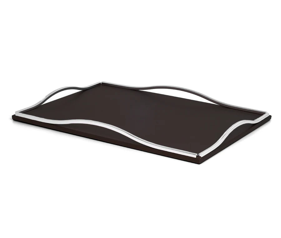 Ein besonderes Gestaltungsmerkmal sind die vier dekorativen Griffe, die je nach Ausführung in Chrom, Satiniertem Gold oder brüniertem Messing akzentuiert sind. Sie setzen luxuriöse Highlights und unterstreichen den edlen Charakter des Tabletts. Wave eignet sich ideal als stilvolles Servier- oder Ablagetablett und setzt in Wohn- oder Arbeitsbereichen einen ausdrucksstarken Akzent. Weitere Ausführungen und Anpassungen sind auf Anfrage möglich.