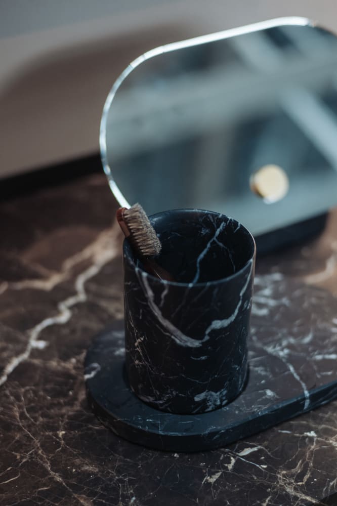 Die Bad-Accessoires Kollektion Constellation von Studiopepe by Agape, bestehend aus Badaccessoires aus schwarzem Marquina Marmor. Die postmodernen Geometrien der Kollektion unterstreichen das skulpturale Aussehen des polierten Marmors, der wirkt, als ob er vom Wasser geformt wurde.