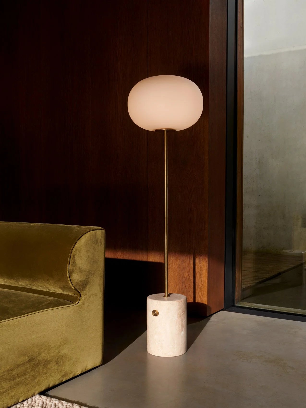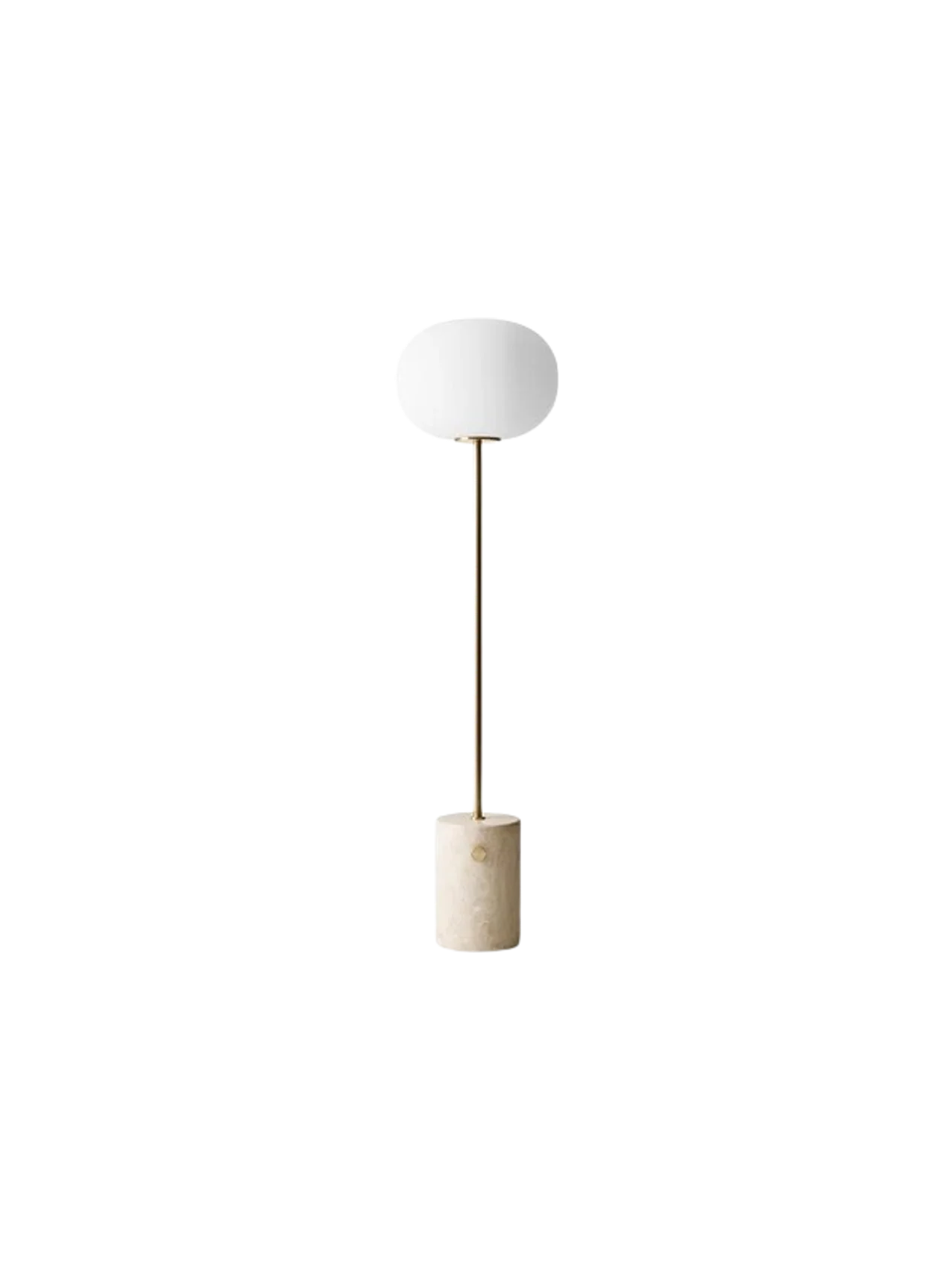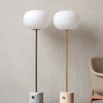 Die JWDA Floor Lamp überträgt den ikonischen Charakter der Serie in ein elegantes Standformat. Opalglas, Metall und Naturstein treffen auf eine klare Silhouette mit starker Präsenz. Über den integrierten Messingdimmer lässt sich die Lichtstimmung stufenlos anpassen – von Lese- bis Ambientelicht.