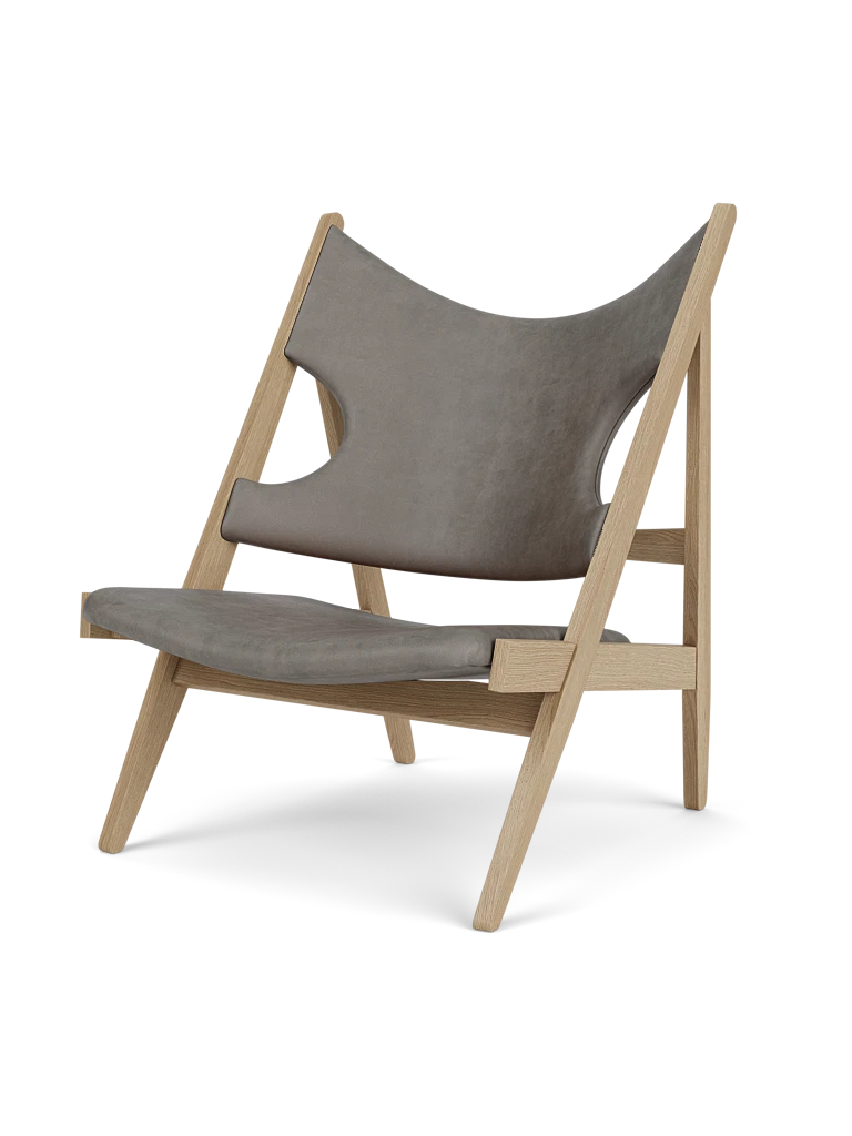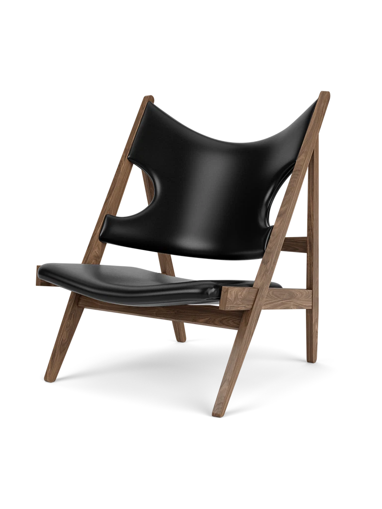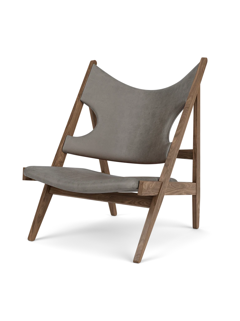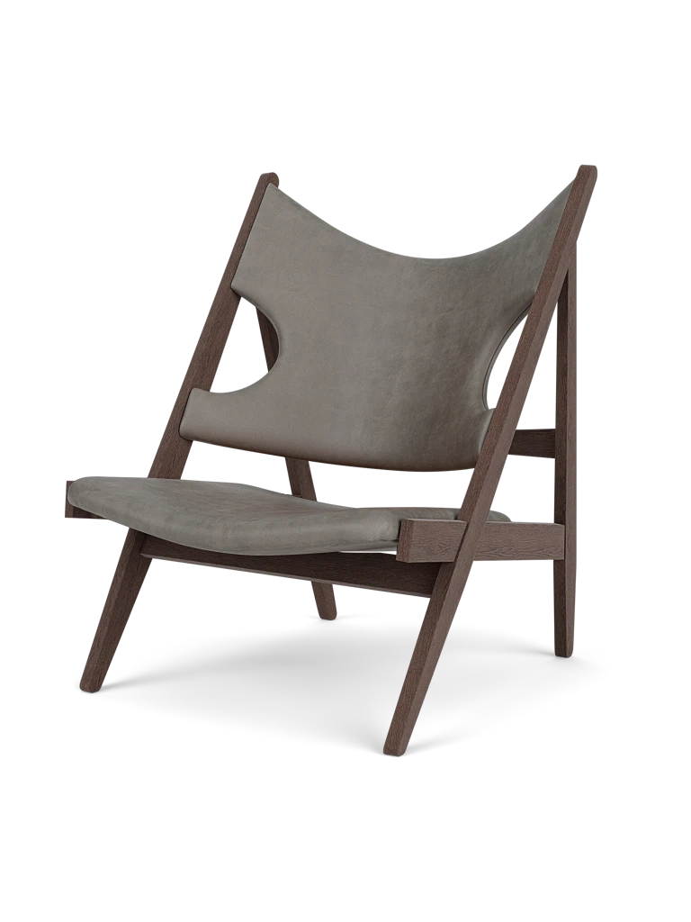 Die Ausführung aus Eiche oder Nussbaum verleiht dem Sessel eine markante, elegante Präsenz. In Kombination mit dem feinen Lederbezug entsteht ein Möbelstück, das Wärme, Tiefe und Exklusivität ausstrahlt. Die charakteristischen Ellbogenaussparungen, Namensgeber des Strickstuhls, ermöglichen entspannte Armbewegungen und machen den Sessel ideal für Lesen, ruhige Gespräche oder bewusstes Entspannen.