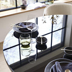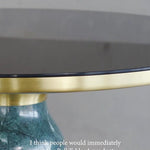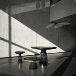 Massiver Marmorfuss in Nero Marquina, poliert und imprägniert, mit Metallaufsatz aus massivem Stahl, schwarz lackiert. Oder massiver Marmorfuss in Verde Guatemala, poliert und imprägniert, mit Metallaufsatz aus massivem Messing, klar lackiert. Tischplatte aus Kristallglas, schwarz lackiert.