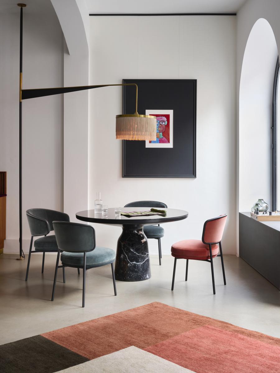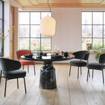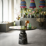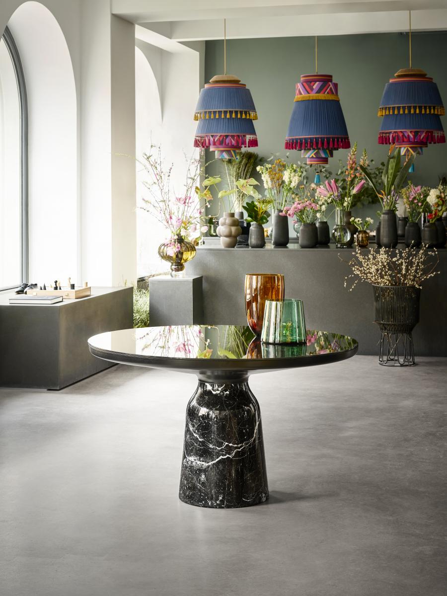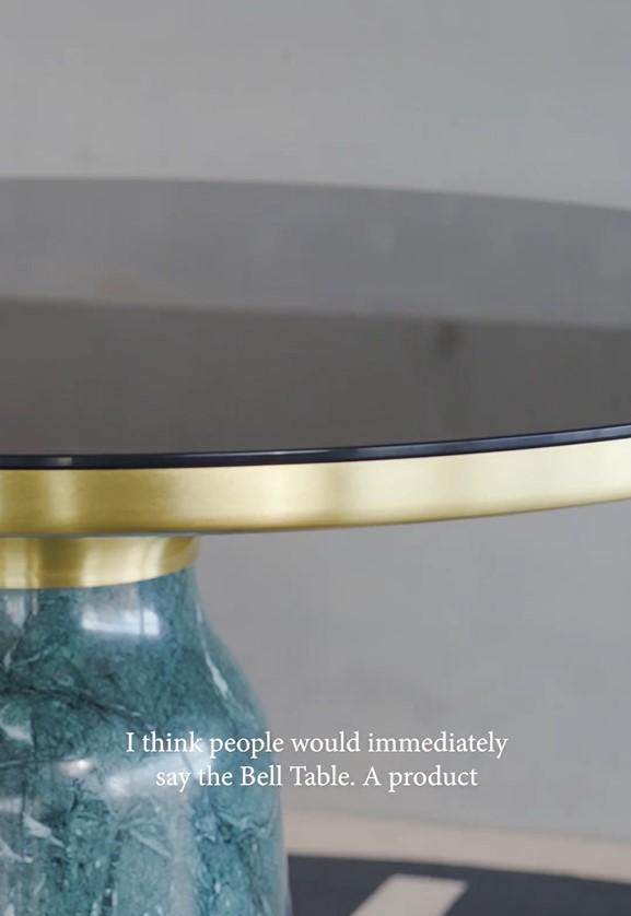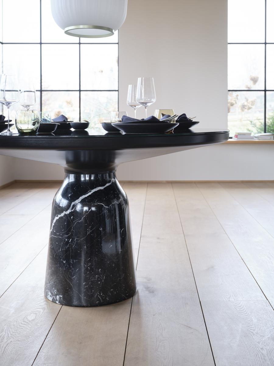 Der Bell Dining Table von Sebastian Herkner vereint elegante Form mit edlen Materialien. Der charakteristische, glockenförmige Schwung bleibt erhalten, während der handpolierte Marmorfuss dem Design Standfestigkeit und zeitlose Eleganz verleiht. Die kontrastive Maserung zweier Marmorarten schafft ein subtiles Farbspiel. Ein moderner Klassiker, der seit 2012 durch seine ungewöhnliche Materialkombination besticht und jeden Essbereich aufwertet.