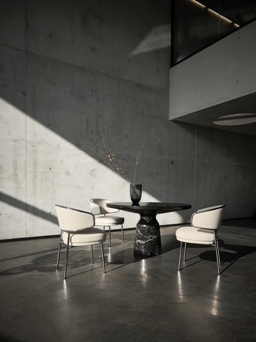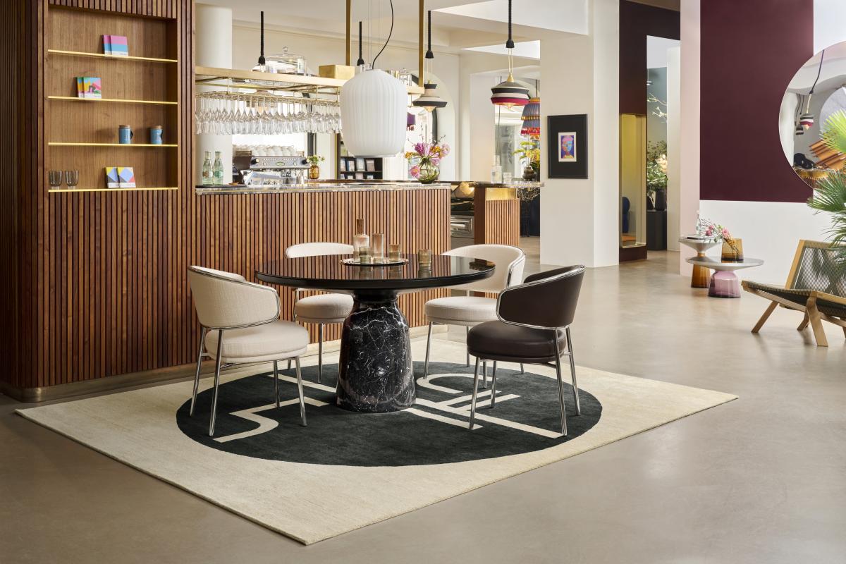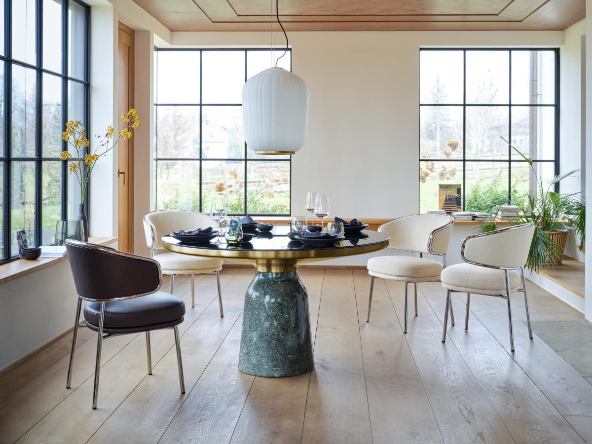Der Bell Dining Table von Sebastian Herkner vereint elegante Form mit edlen Materialien. Der charakteristische, glockenförmige Schwung bleibt erhalten, während der handpolierte Marmorfuss dem Design Standfestigkeit und zeitlose Eleganz verleiht. Die kontrastive Maserung zweier Marmorarten schafft ein subtiles Farbspiel. Ein moderner Klassiker, der seit 2012 durch seine ungewöhnliche Materialkombination besticht und jeden Essbereich aufwertet.