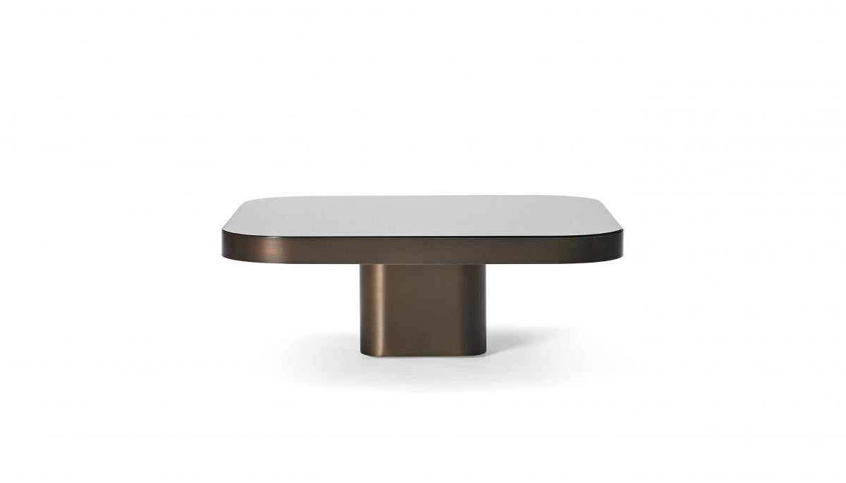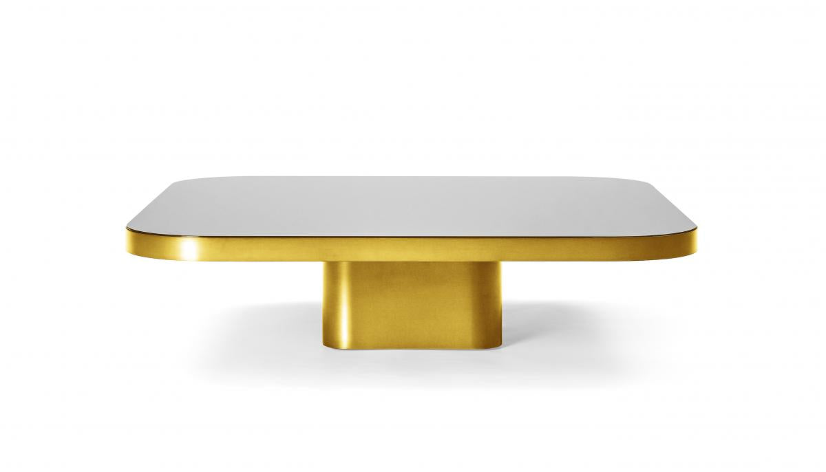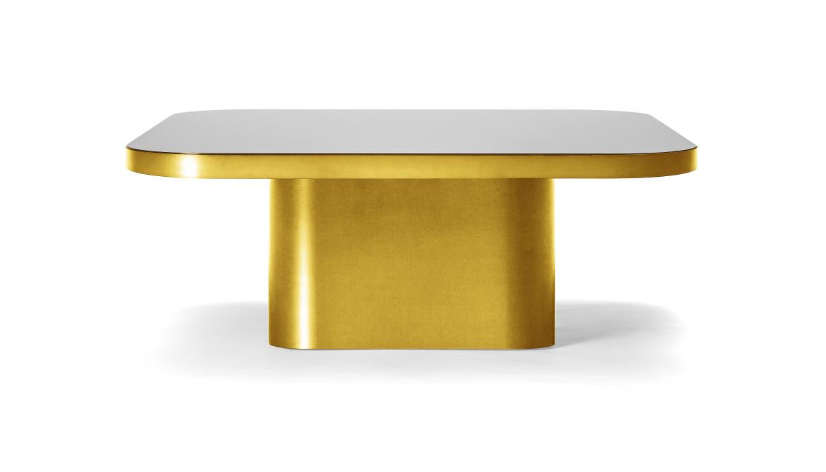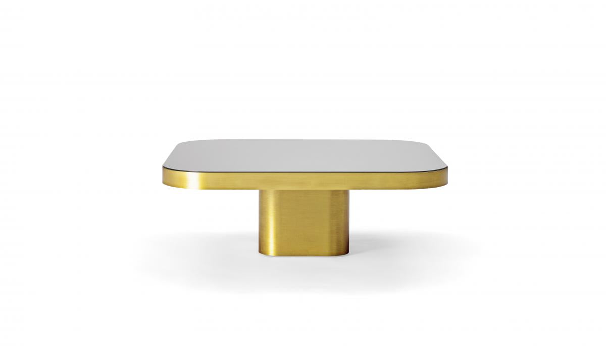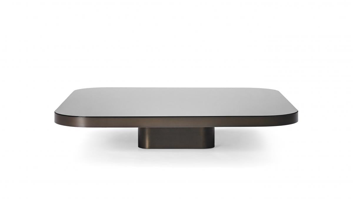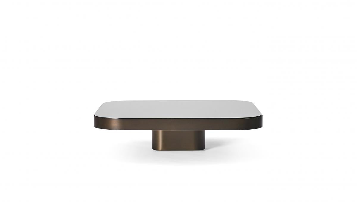 Erhältlich in drei Tischplattengrößen und vier Höhen. Tisch aus massivem Messingblech, natur oder brüniert, klar lackiert oder aus massivem Stahlblech schwarz lackiert oder aus massivem Aluminiumblech, klar lackiert. Tischplatte aus Kristallglas, verspiegelt oder schwarz lackiert, oder aus Marmor in verschiedenen Ausführungen, poliert und imprägniert. Höhenverstellbare Filzgleiter.