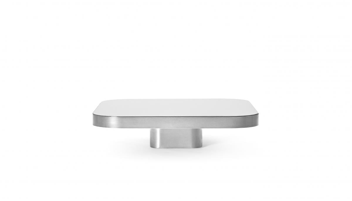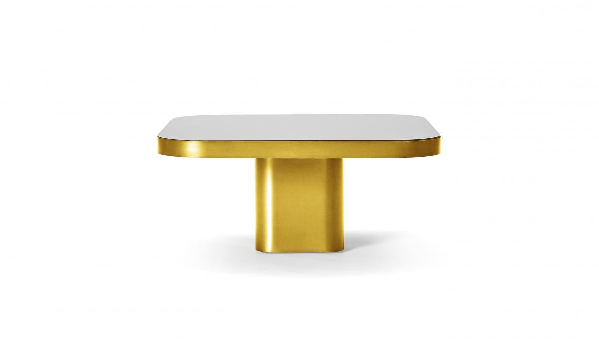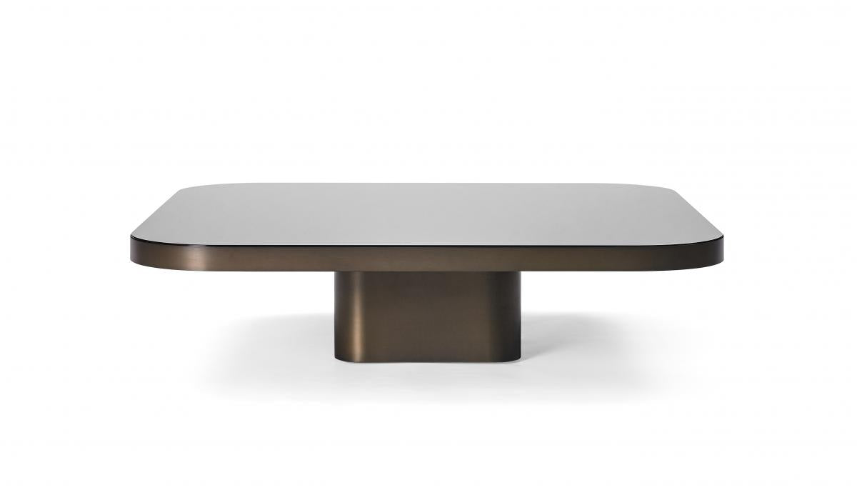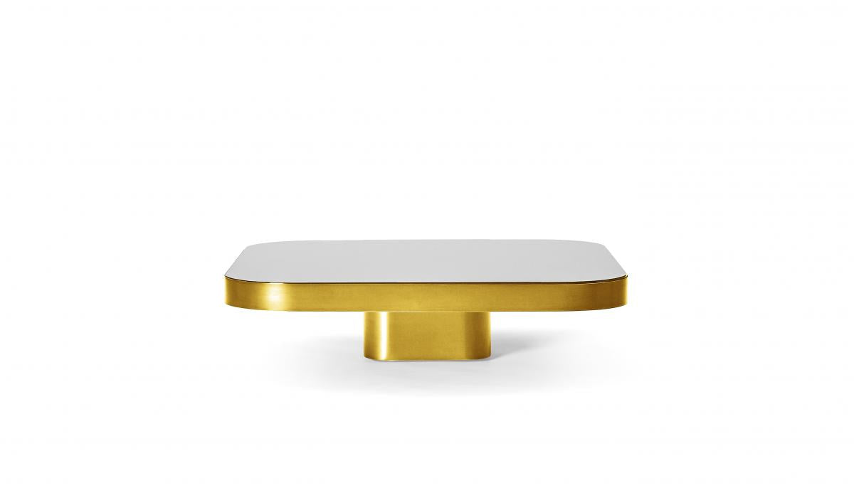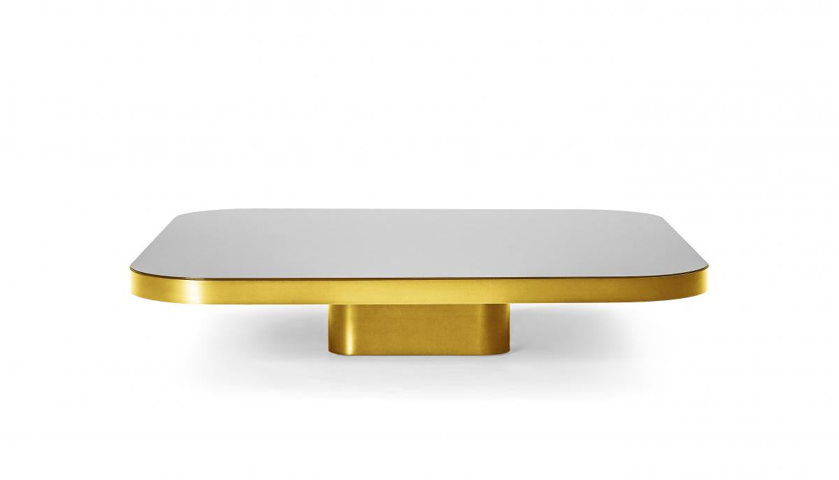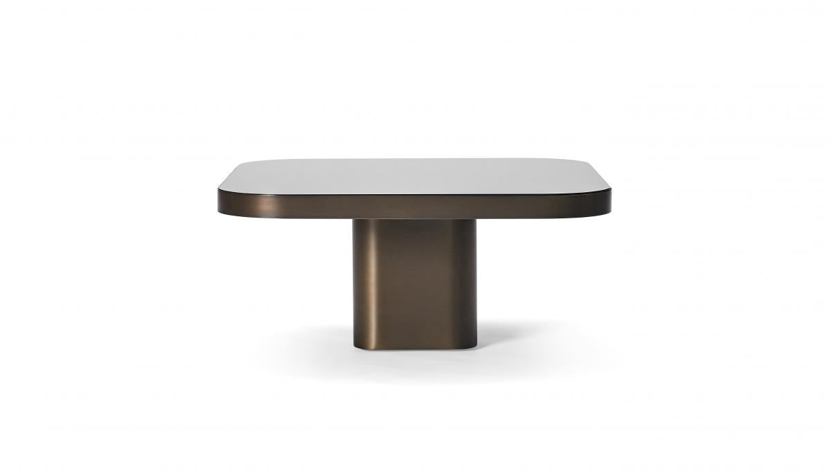 Erhältlich in drei Tischplattengrößen und vier Höhen. Tisch aus massivem Messingblech, natur oder brüniert, klar lackiert oder aus massivem Stahlblech schwarz lackiert oder aus massivem Aluminiumblech, klar lackiert. Tischplatte aus Kristallglas, verspiegelt oder schwarz lackiert, oder aus Marmor in verschiedenen Ausführungen, poliert und imprägniert. Höhenverstellbare Filzgleiter.