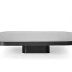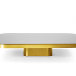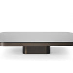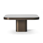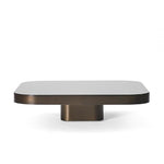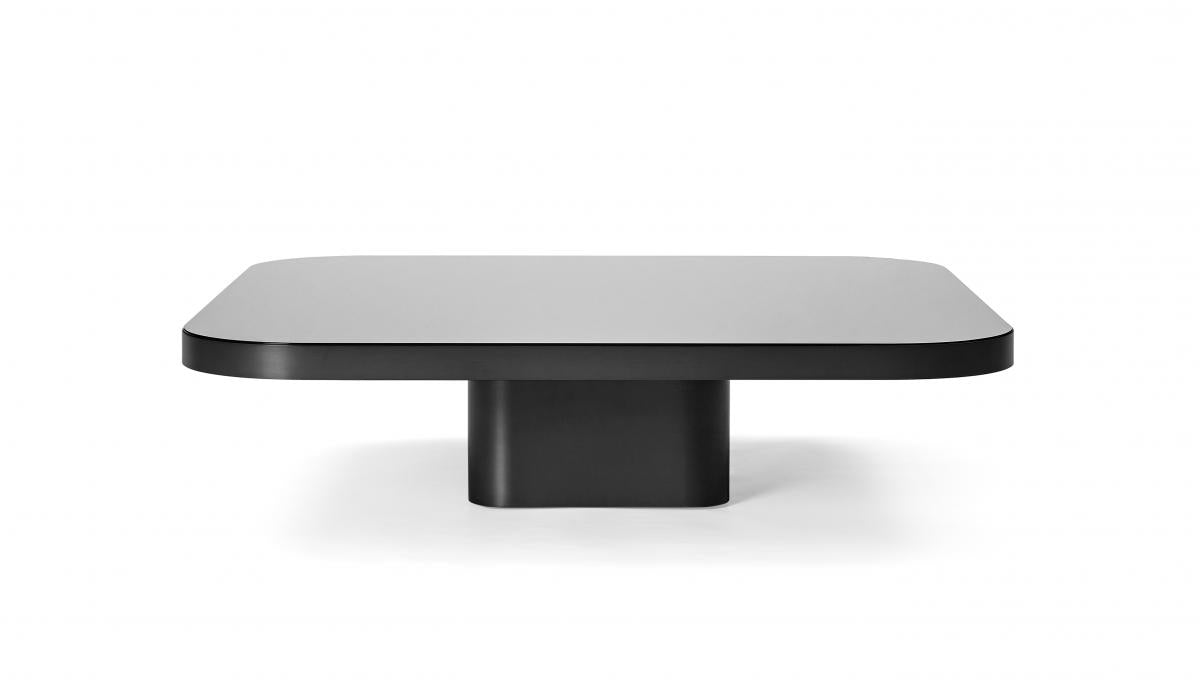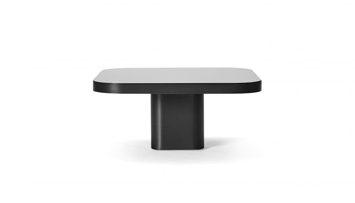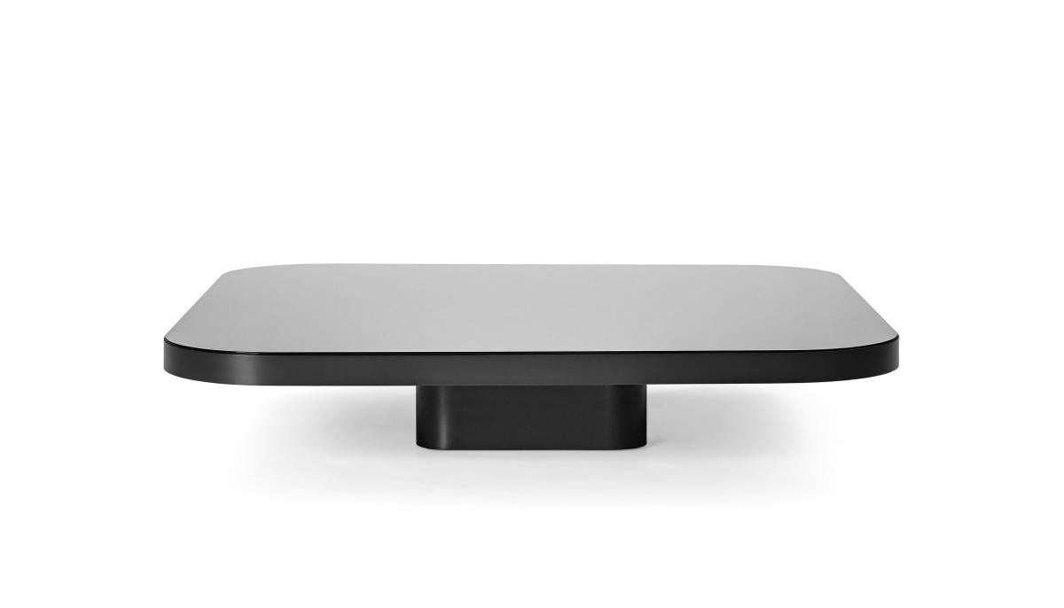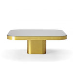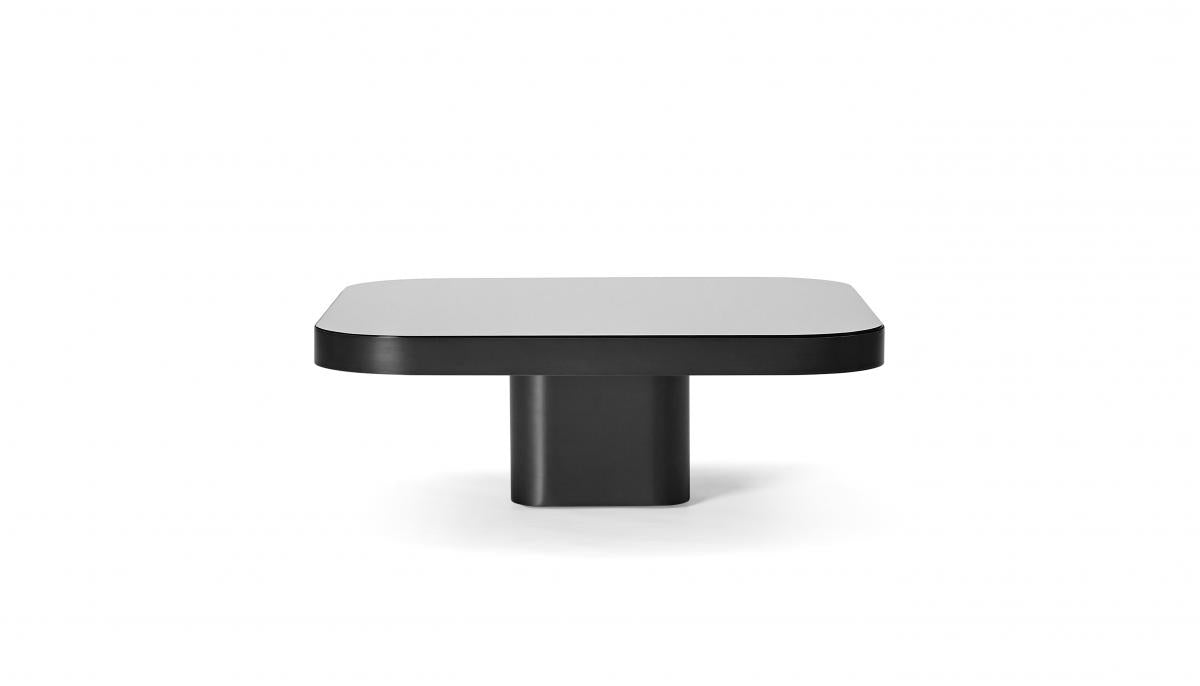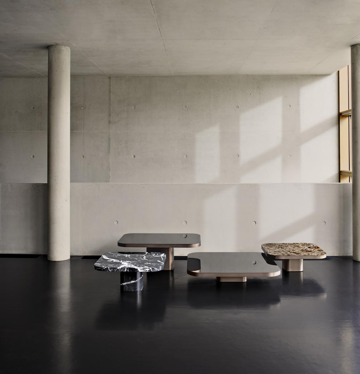 Erhältlich in drei Tischplattengrößen und vier Höhen. Tisch aus massivem Messingblech, natur oder brüniert, klar lackiert oder aus massivem Stahlblech schwarz lackiert oder aus massivem Aluminiumblech, klar lackiert. Tischplatte aus Kristallglas, verspiegelt oder schwarz lackiert, oder aus Marmor in verschiedenen Ausführungen, poliert und imprägniert. Höhenverstellbare Filzgleiter.