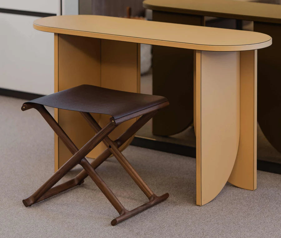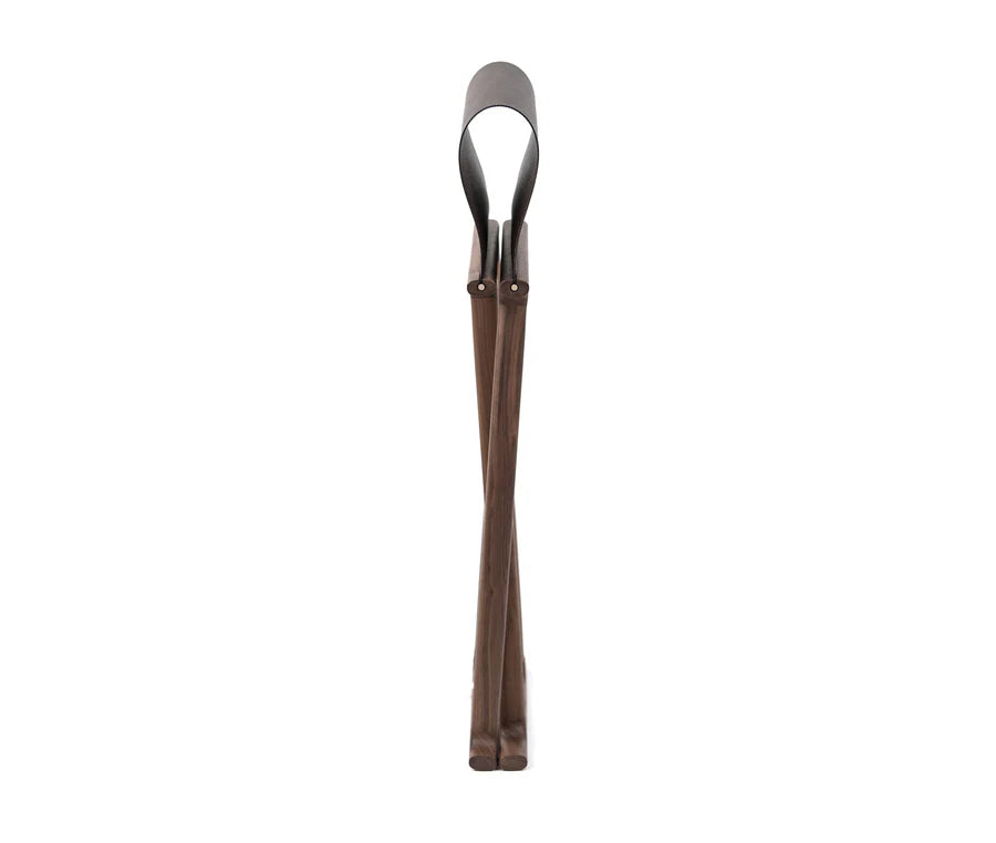 Der elegante Klapphocker überzeugt durch seine hochwertige handwerkliche Ausführung und ein klar definiertes, geometrisches Design. Gefertigt aus massivem Walnussholz, wird die Konstruktion durch ein markantes X-Gestell geprägt, das Stabilität und visuelle Leichtigkeit vereint. Der Sitz aus vollnarbigem Leder sorgt für hohen Komfort und eine edle Haptik.