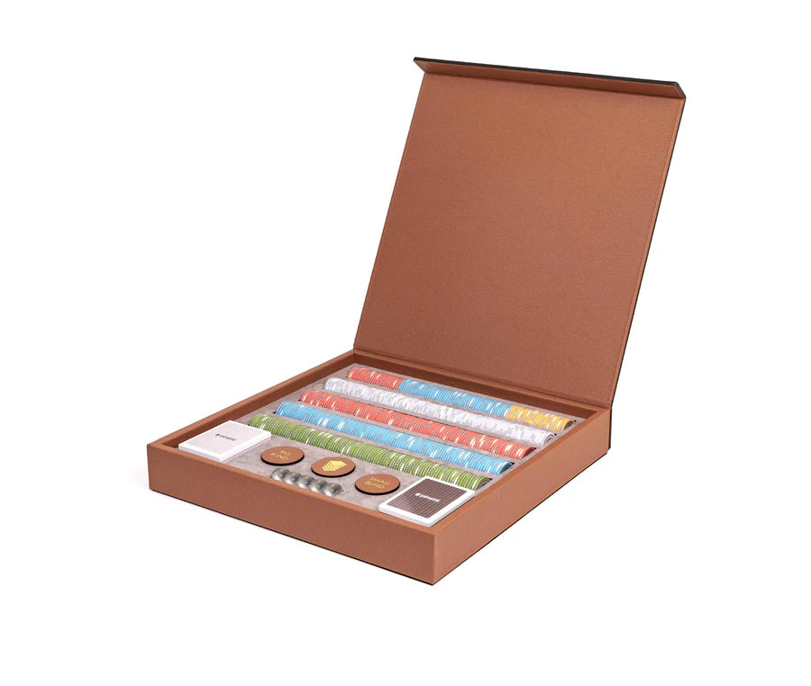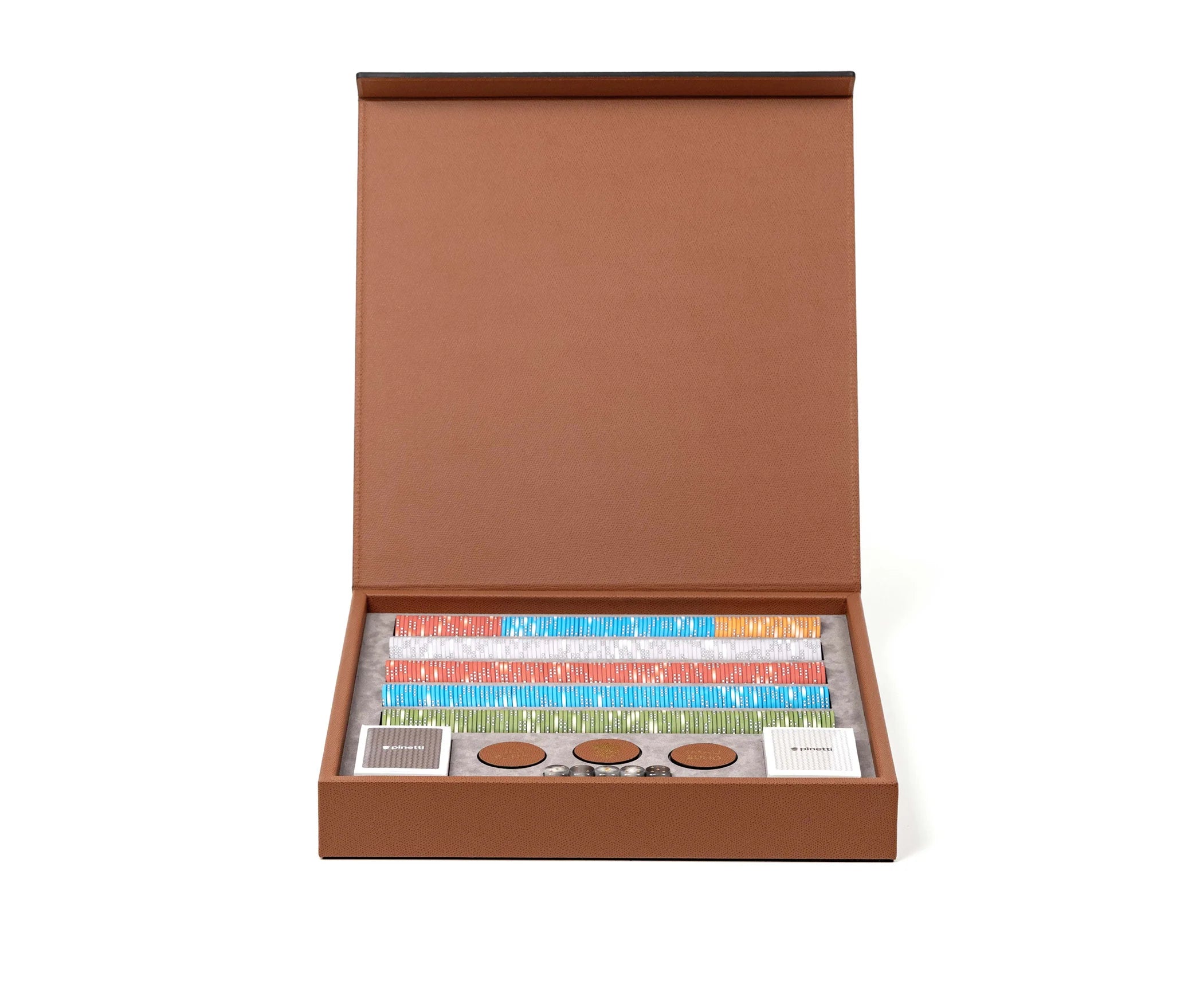Luxuriöse Holzbox, vollständig bezogen mit hochwertigem Kalbsleder, mit Magnetverschluss. Set bestehend aus 500 Keramik-Pokerchips, zwei Pinetti-Kartenspielen, fünf Würfeln, einem Dealer-Button und zwei Ledermünzen.